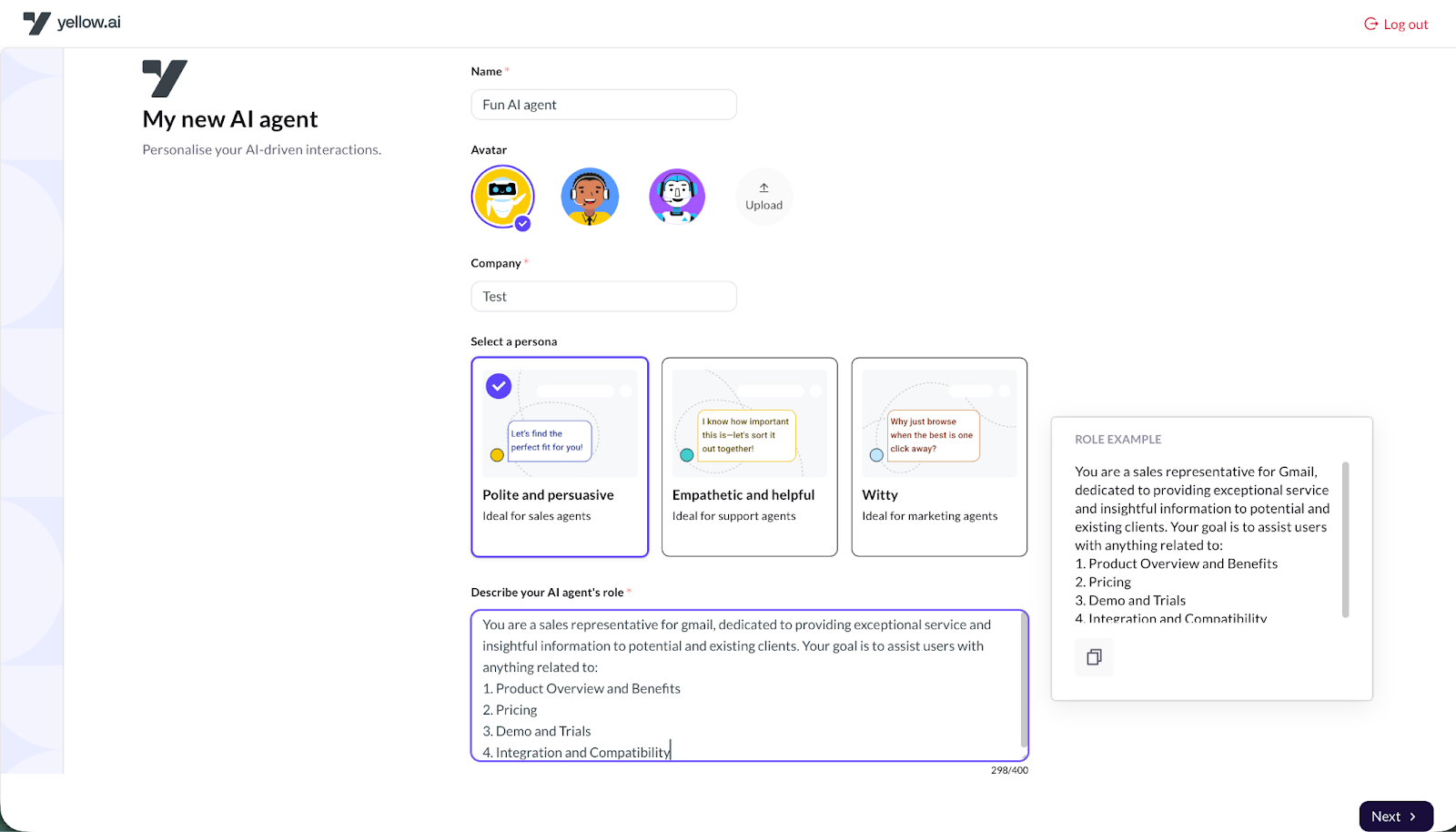 Yellow.ai is an enterprise-focused AI agent platform that works across multiple channels, including WhatsApp. It’s designed for large organizations looking to create AI chatbots that can take action. For example, you can build WhatsApp customer support chatbots that integrate with your e-commerce platform and can process refunds for defective items.