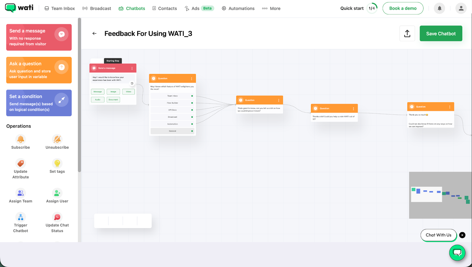 Wati is an all-in-one WhatsApp management platform (its name originally stood for WhatsApp Team Inbox). Part of this includes the ability to make powerful WhatsApp chatbots that automate your support, lead generation, and marketing efforts.