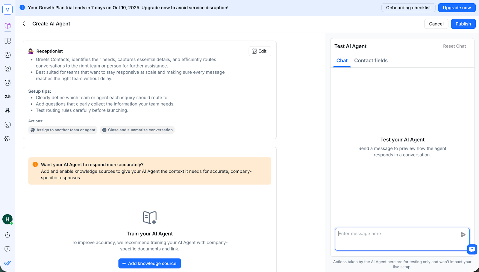 Chatbase has a decent free plan with 100 free messages per month, making it easy to get started. Paid plans are affordable and start at $40 per month — but you’re limited to only one AI chatbot. If you want an entire team of WhatsApp bots, you need to look elsewhere.