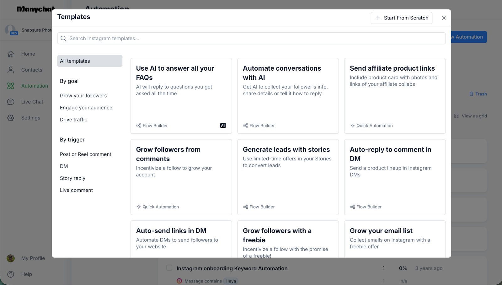Manychat is a popular WhatsApp chat bot example, though it also works with Messenger, Instagram, and TikTok. It launched before the latest AI boom, so its drag-and-drop chatbot builder can feel a bit dated. However, it still lets you create custom flows, which gives you a lot of control over how your WhatsApp bot responds to your customers’ messages.