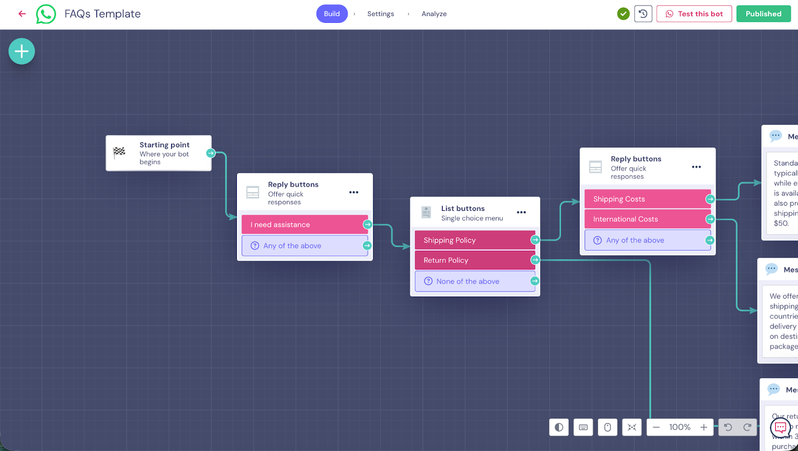 Limitations: There are cheaper plans, but they don’t include WhatsApp bots; no-code builder is flow based