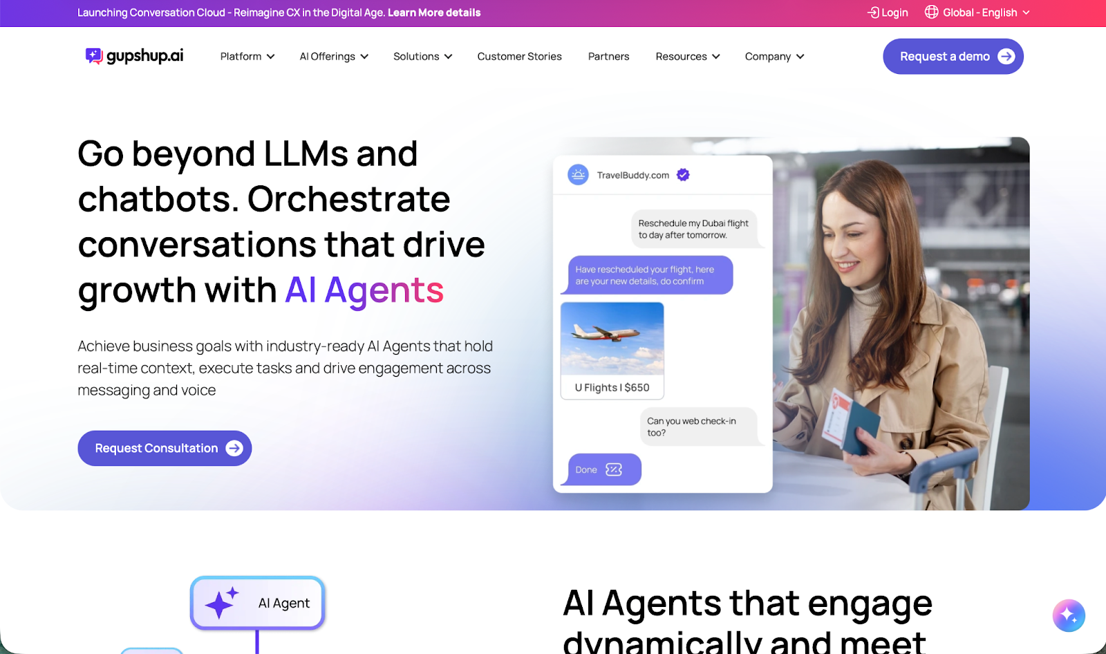 Gupshup bills itself as a conversational AI platform. A big part of that is the ability to use chatbots through channels like WhatsApp to provide customer support, conduct marketing outreach, and generate leads. It also supports human customer support agents, so your WhatsApp chatbot can automatically send complex problems to one of your team.