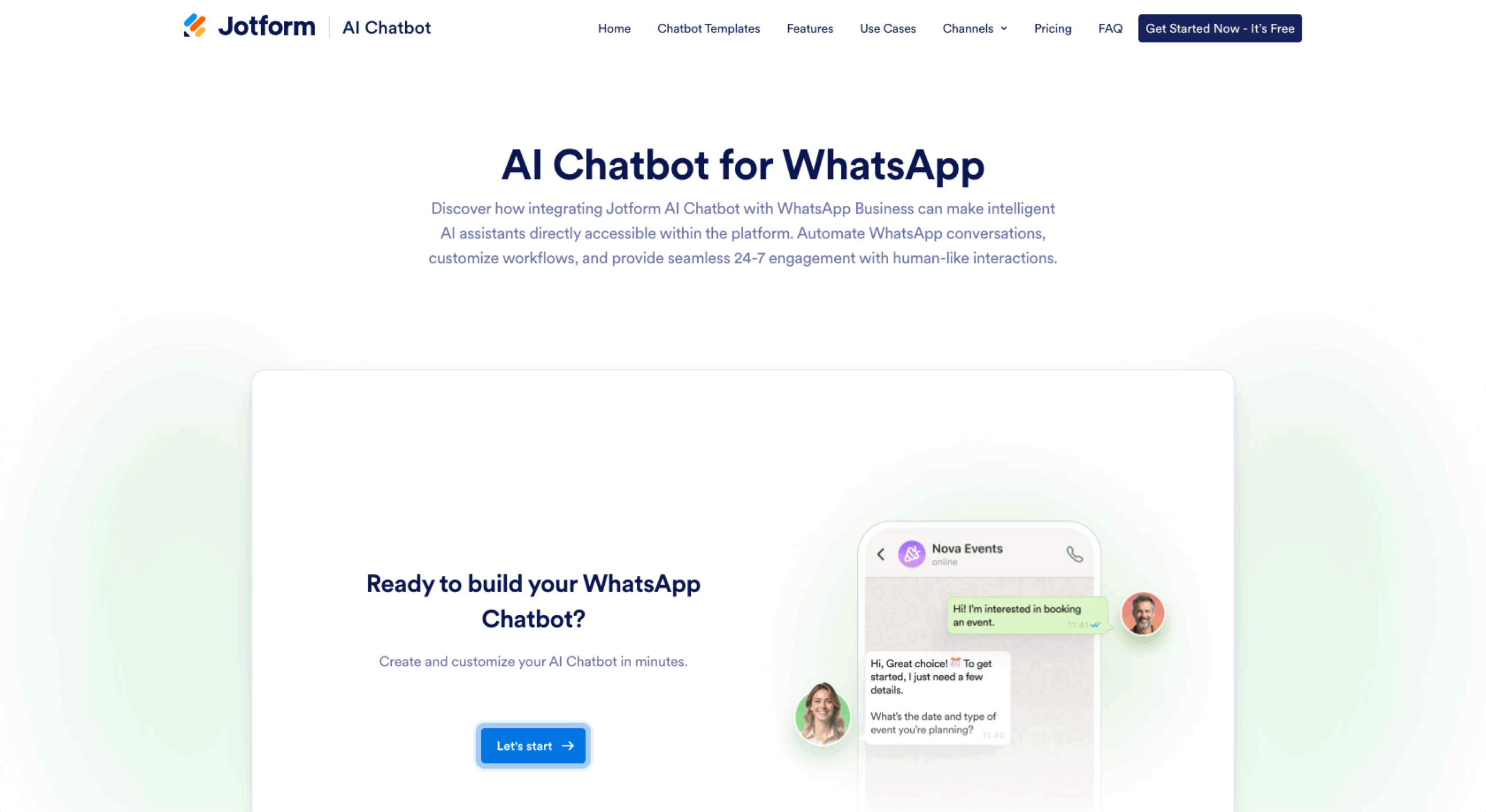 Jotform AI Chatbot builder is one of the easiest ways to set up a WhatsApp chatbot. Just connect your WhatsApp Business Account, and with the no-code Agent Builder, you can have a chatbot up and running in just a few minutes.