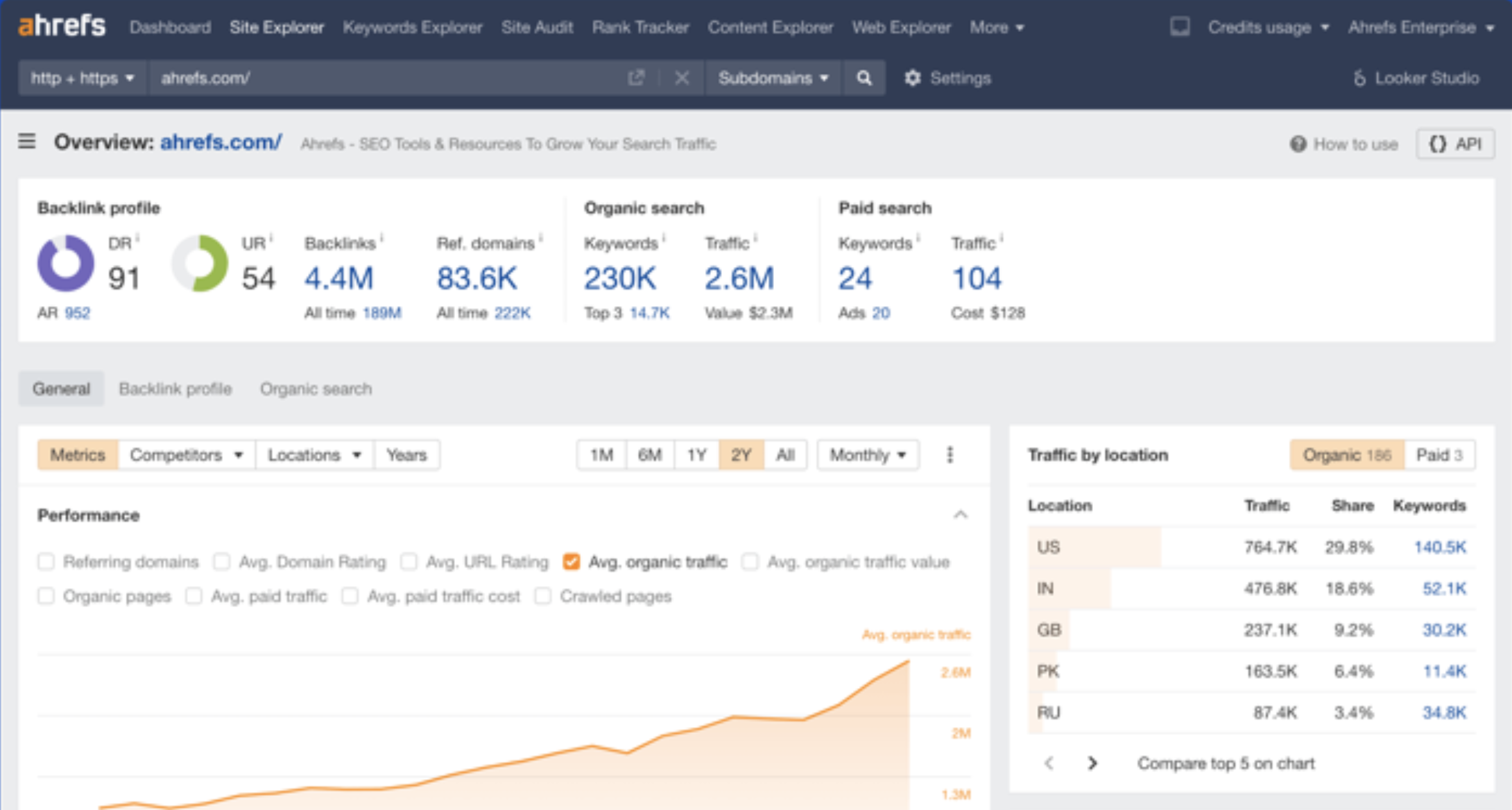 Key features: Ahrefs offers comparison tools to examine a website’s past and current performance data. The tool monitors backlinks over time and deep dives into predictive keyword performance and the impact of SEO on traffic.