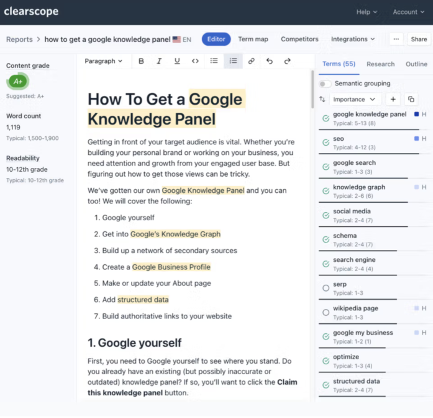 Limitations: Clearscope focuses on content optimization and development, and in my experience, it does that incredibly well. It may lack some features other platforms have (e.g., backlink tracking and competitor analysis).