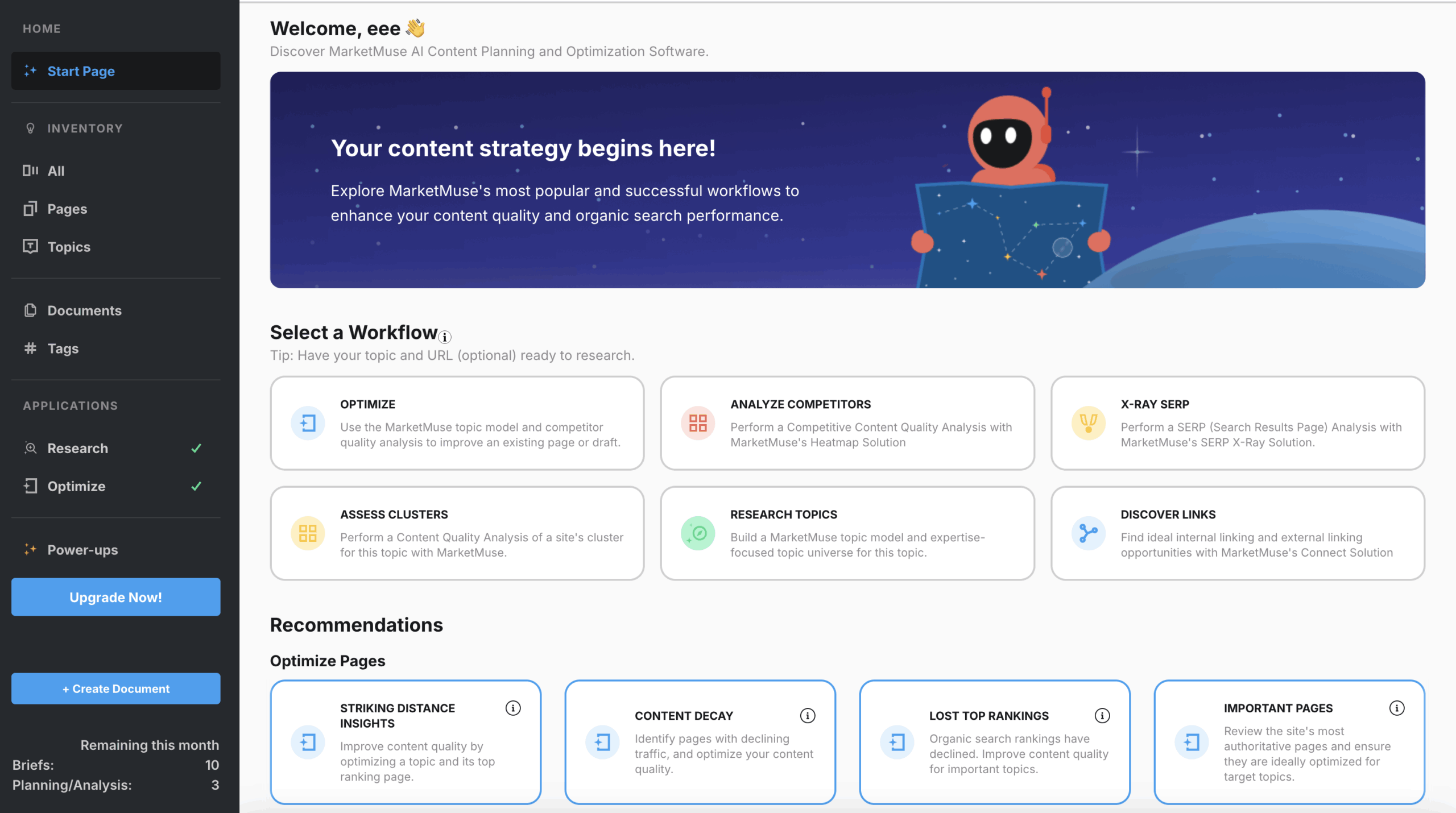 Plans/Pricing: The free plan allows users 10 queries per month for a single user. The entry level premium plan, Optimize, costs $99 per month, with up to five content briefs and one strategy document per month. The Research plan ($249 per month) permits users up to 10 content briefs and three strategy docs per month. The Strategy plan ($499 per month) comes with 20 content briefs and five strategy documents per month.