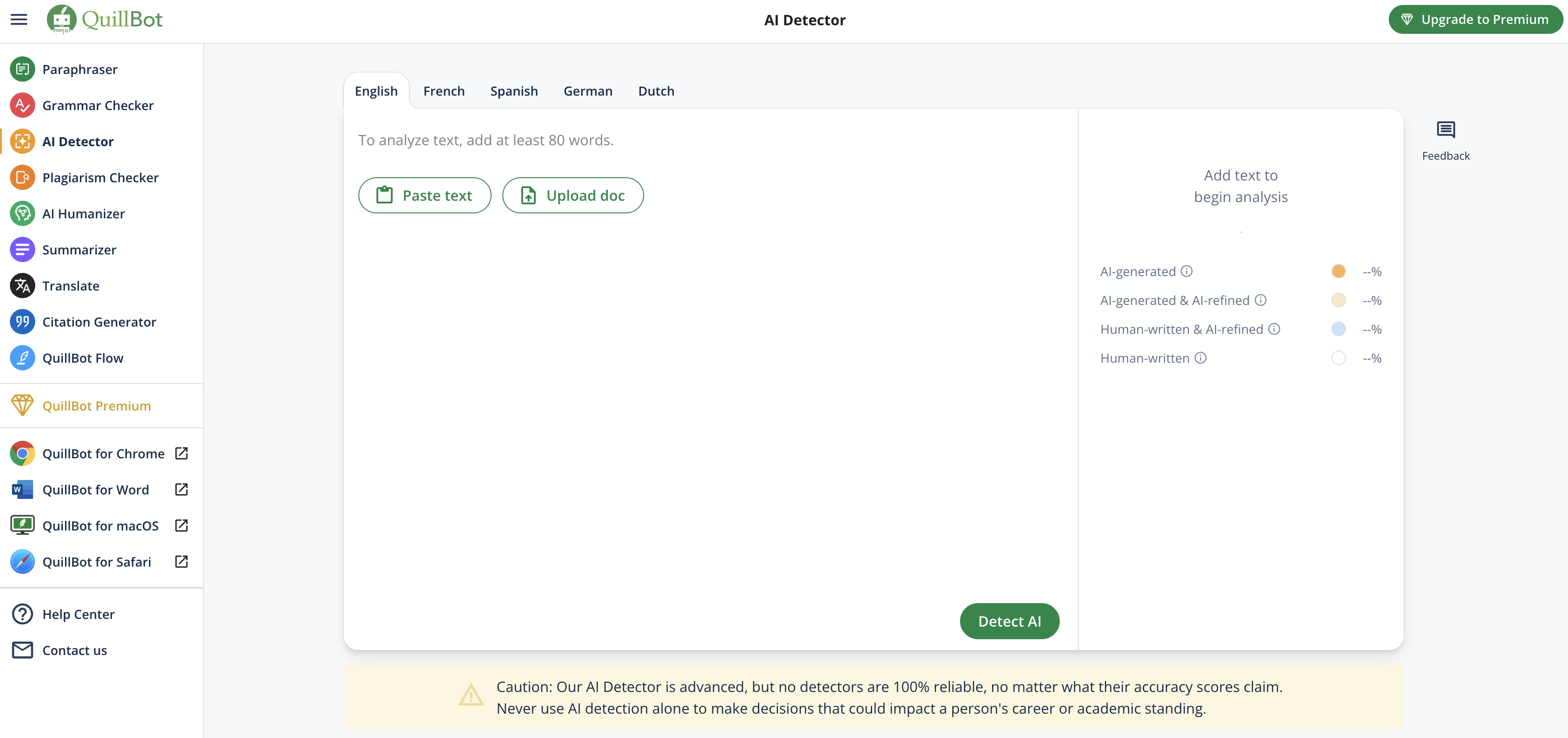 Plans/Pricing: QuillBot only offers two plans. The free account allows users to paraphrase up to 125 words, generate basic summaries, access basic proofreading, and use the AI Detector tool (up to 1,200 words). The Premium plan costs $8.33 per month and allows for unlimited paraphrasing and advanced proofreading tools, along with everything in the free plan.