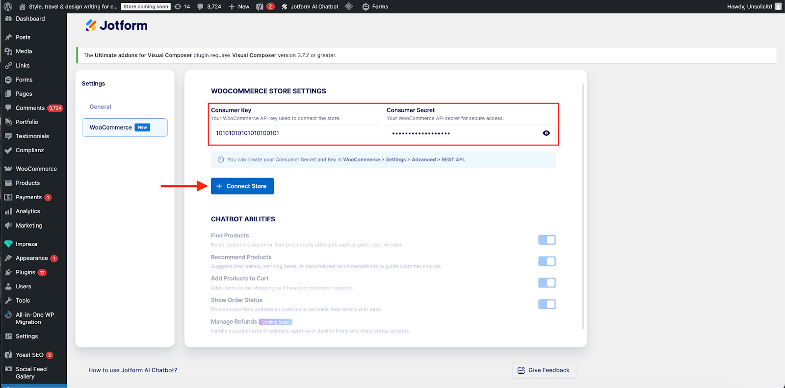 To sync your WooCommerce account with your agent, enter your Consumer Key and Consumer Secret, then click Connect Store.