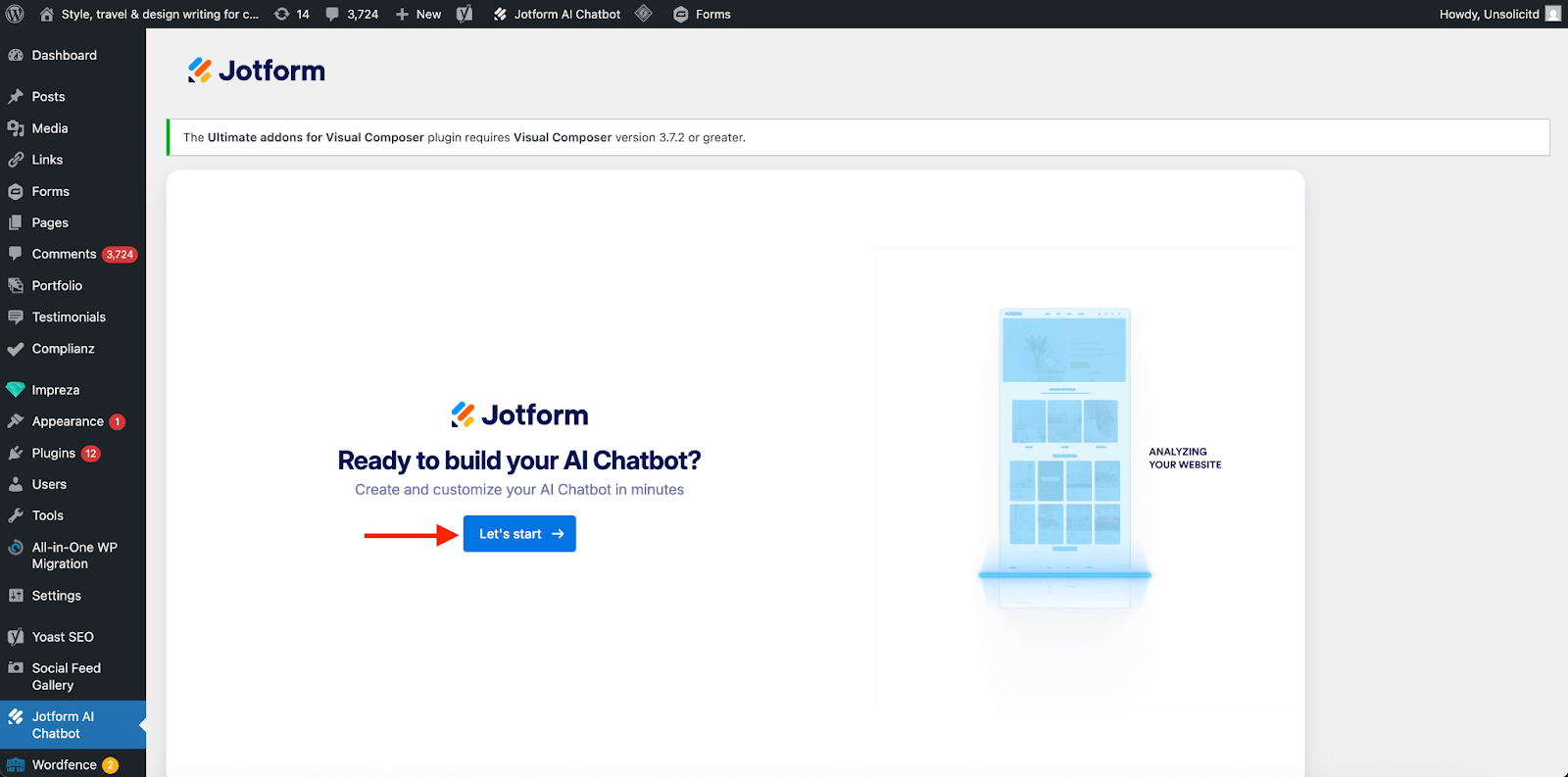Now you’ll need to connect your Jotform account. In the sidebar of your dashboard, click Jotform AI Chatbot to open the plugin. Then click Let’s start to begin the authorization process.