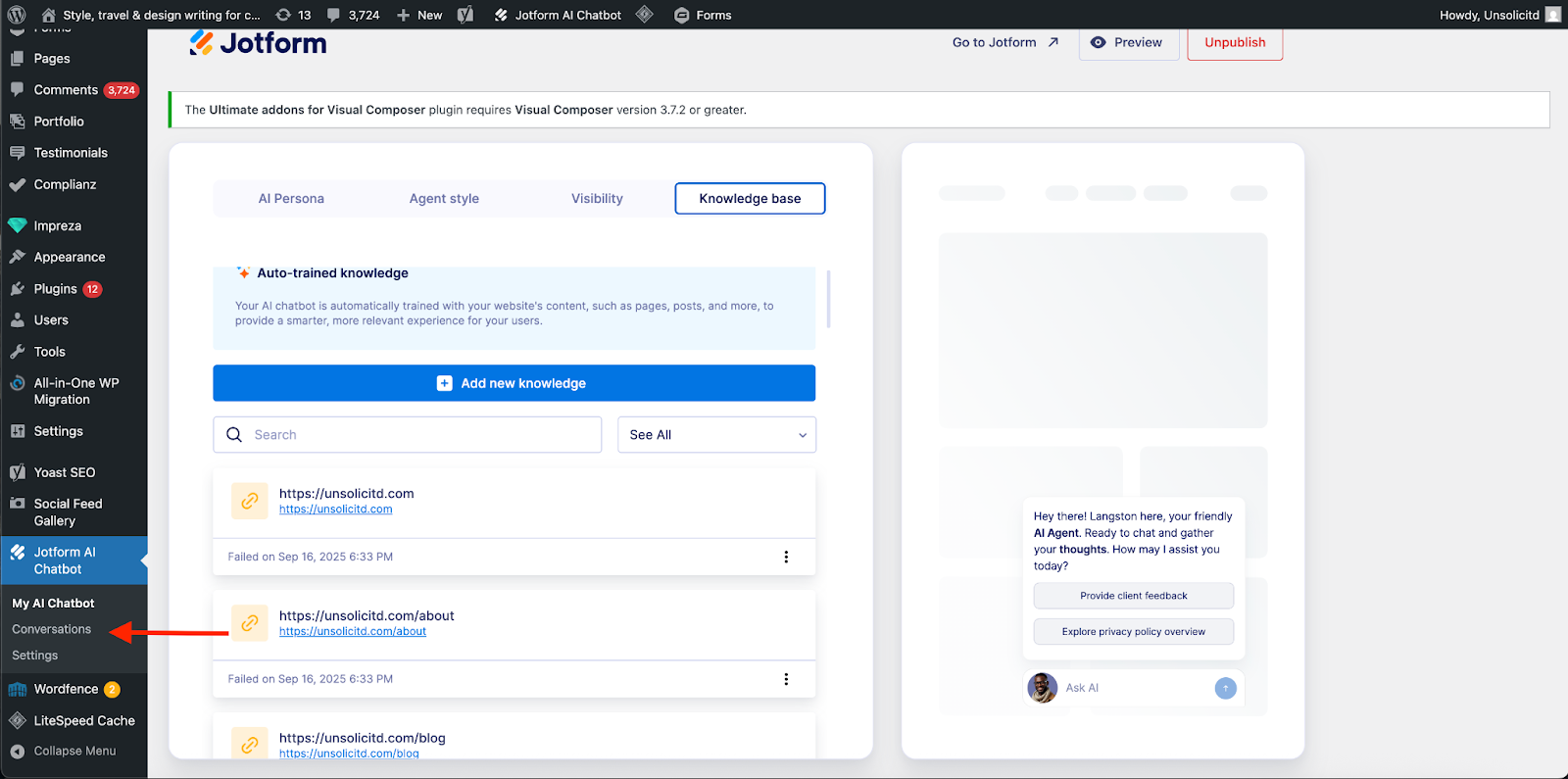 Even after your agent has been published on your site, you can still go into your WordPress plugin at any time to adjust the agent’s style or update its knowledge base.