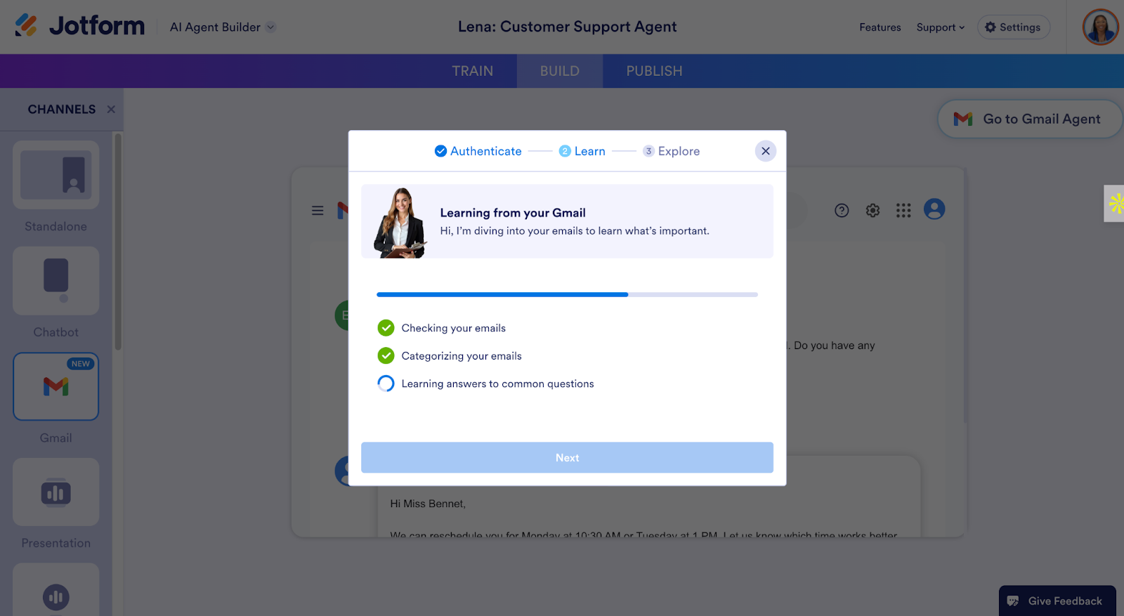 One standout feature of the Gmail Agent is how easily it syncs with the rest of your Jotform AI Agents. This robust and cohesive solution draws from the same knowledge base as your phone, web chat, and social media AI agents to ensure consistency in messages, brand style, and tone regardless of where customers reach out. Other features of the Gmail Agent include the abilities to set a custom greeting, add an email signature to the autogenerated draft, exclude email types, and add custom email addresses. The Jotform Gmail Agent continues to train itself using new emails, so the more you use it, the better your future drafts become.
