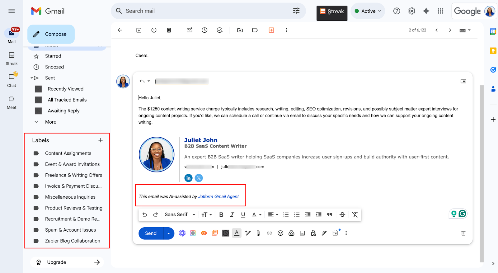 The moment you connect your Gmail account to the Jotform Agent builder, the Gmail Agent starts working immediately — no extra steps or setups required. It’ll categorize your inbox with smart labels and learn from your email history to understand how you answer common questions. As new emails come in, the email assistant prioritizes important inquiries and instantly drafts on-brand responses to ensure nothing critical falls through the cracks. The AI drafts are personalized and contextually relevant based on your previous conversations. To top it all off, the Gmail Agent writes in your brand style to reflect your persona and your company’s policies.