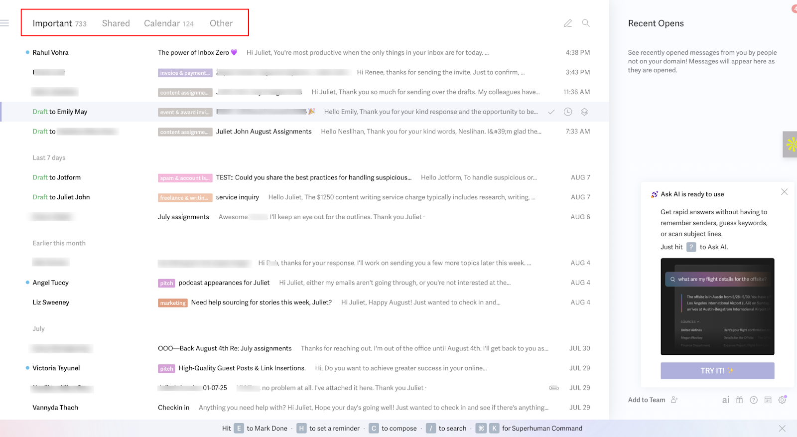 Superhuman earned a spot on this list for its comprehensive suite of AI features that help you save hours every week on email workflows. One of its top features is how it organizes your emails, beginning with Split Inbox. Split Inbox categorizes emails into designated sections such as “important,” “calendar,” and “other” and then routes incoming emails into their corresponding inboxes to minimize distractions and improve your focus. It also automatically labels emails with context-specific labels that make it easy for you to know what’s in each email before you even read it. Want to stop promotional emails, pitches, and newsletters from cluttering your inbox? The email assistant makes that easy with auto-archive, so you don’t have to see them at all.