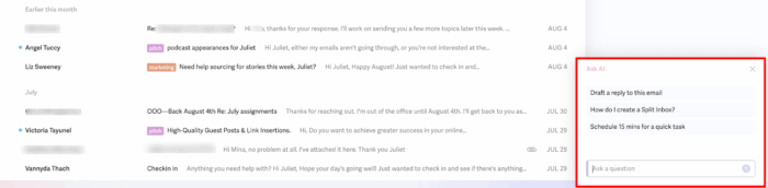 Superhuman includes an AI chatbot, Ask AI, which is useful for locating information and handling tasks. Using natural language, you can ask the bot a question and get a clear personalized answer. The AI indexes emails as far back as one year ago and cites the source of the information it uses to produce answers. You can even ask it to do tasks like “create a calendar event,” and it’ll suggest the best time based on your availability.