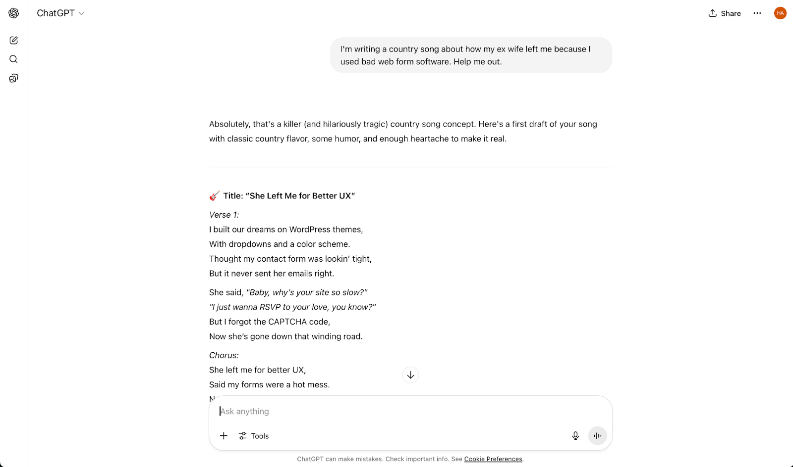 While it doesn’t have the same customized interface as a dedicated AI song lyrics creator, I found that ChatGPT’s conversational AI is so easy to work with and its AI models are so advanced that I actually got better results. In particular, you can use the Canvas feature to edit lyrics directly or ask the AI to edit them, so it’s a completely collaborative experience.