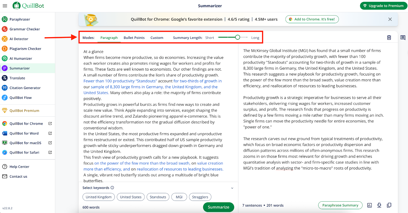 2. QuillBot AI Summarizer: Best for flexible-format summaries of general content