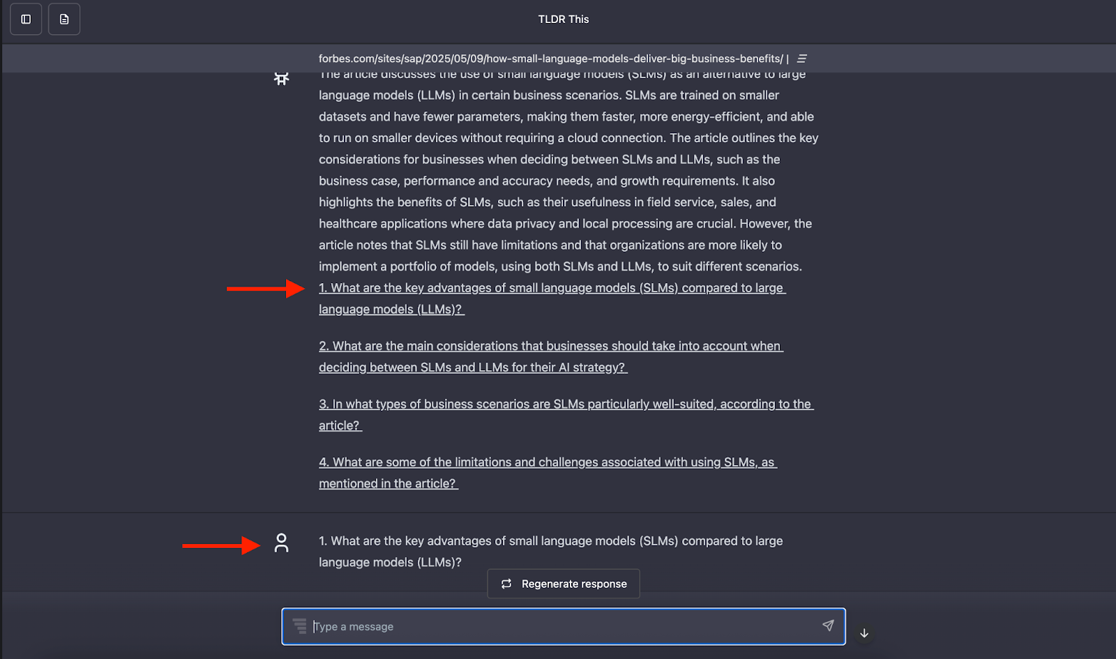 The first one came through with no hiccups. A great feature is its ability to pull important questions from the article within the summary that you can then click to give you more focused answers.