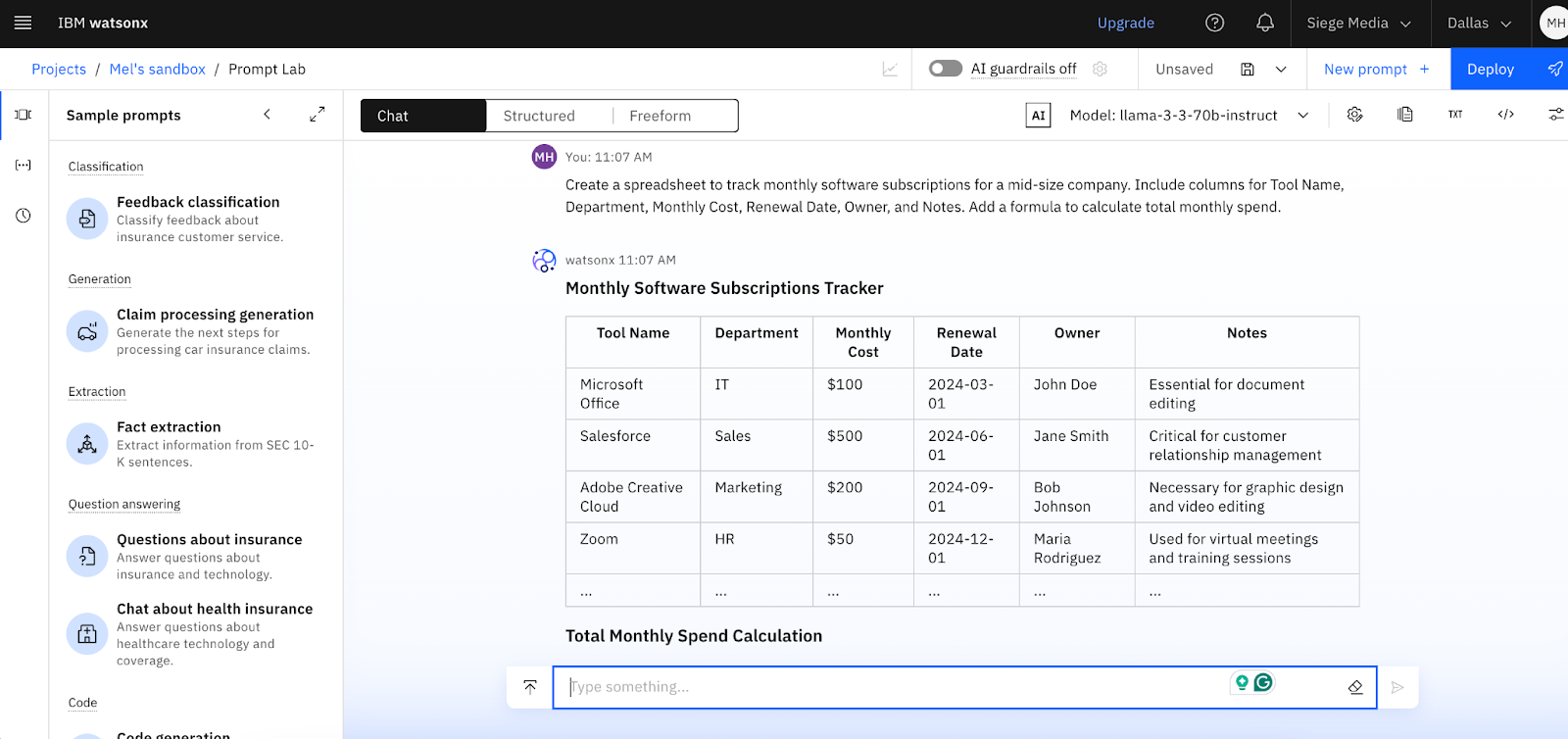 watsonx excels at running large-scale AI workloads, including custom model training, inventory management automation, and flexible hybrid, local, or cloud deployments. It supports advanced analytics scenarios such as generating Excel sheets with formula automation. It can also generate blog or social content when configured, although this requires deeper customization.