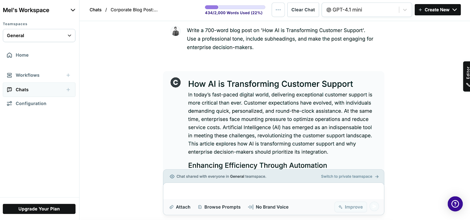 The Prospecting Cockpit stood out to me for sales teams, as it allows data-rich prospect research and hyper-personalized messaging. The Brand Voice and Infobase features also let you train the AI on your own content and style guides. You can additionally manage access and collaboration with public, private, and personal workspaces, plus full role-based permissions.