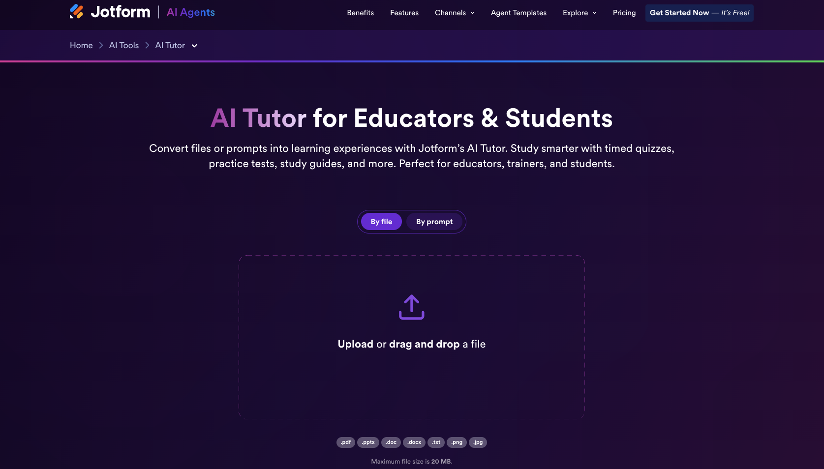 Jotform’s AI Tutor is an out-of-the-box solution that allows you to generate dedicated AI tutors from prompts or uploaded files. This AI tutoring system converts your data into interactive teaching assistants that increase engagement and allow students to take control of their learning experience.