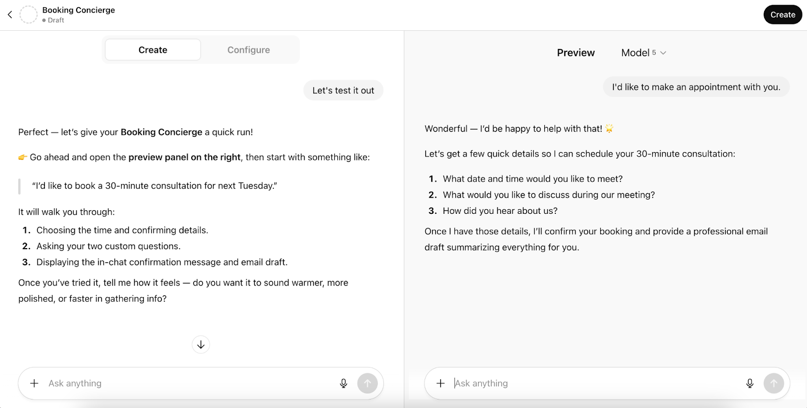 3. Use the GPT builder interface to start building. Inside the builder, you’ll see two panels. The Create/Configure panel on the left is where you’ll chat with the GPT builder to give instructions about your custom GPT. The Preview/Model panel on the right will display your bot as it’s being built. You can easily communicate with the software using natural language. In this example, we’re creating a booking chatbot.