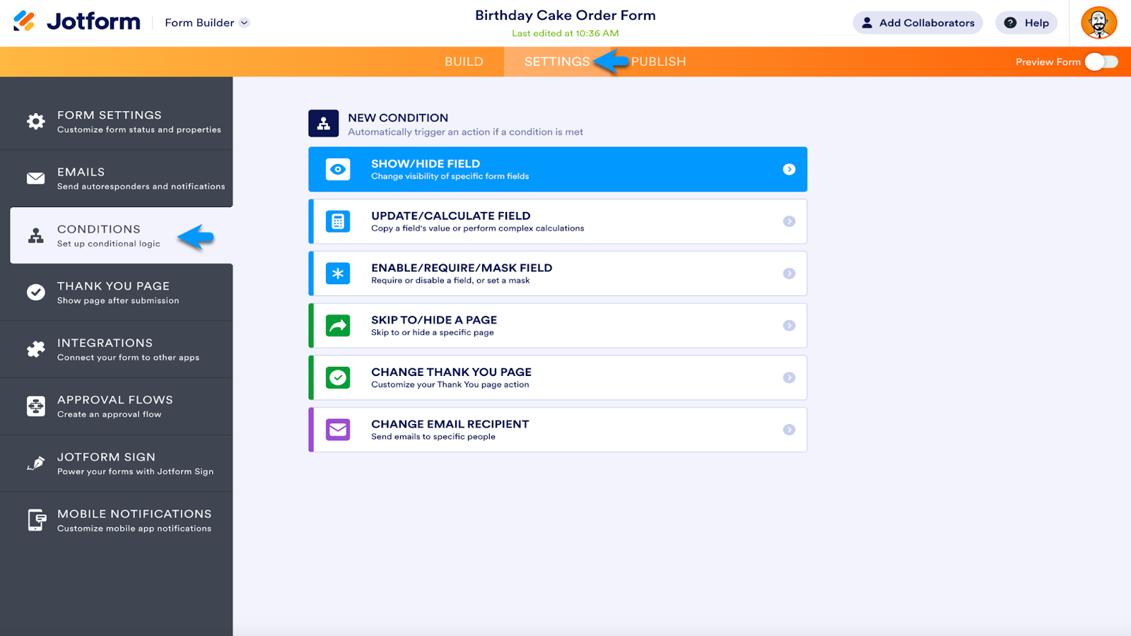 Within the Form Builder, go to the Settings section. Then select Conditions from the menu on the left. You’ll find six different ways to automatically trigger an action if a condition is met, starting with Show/Hide Field at the top of the list.