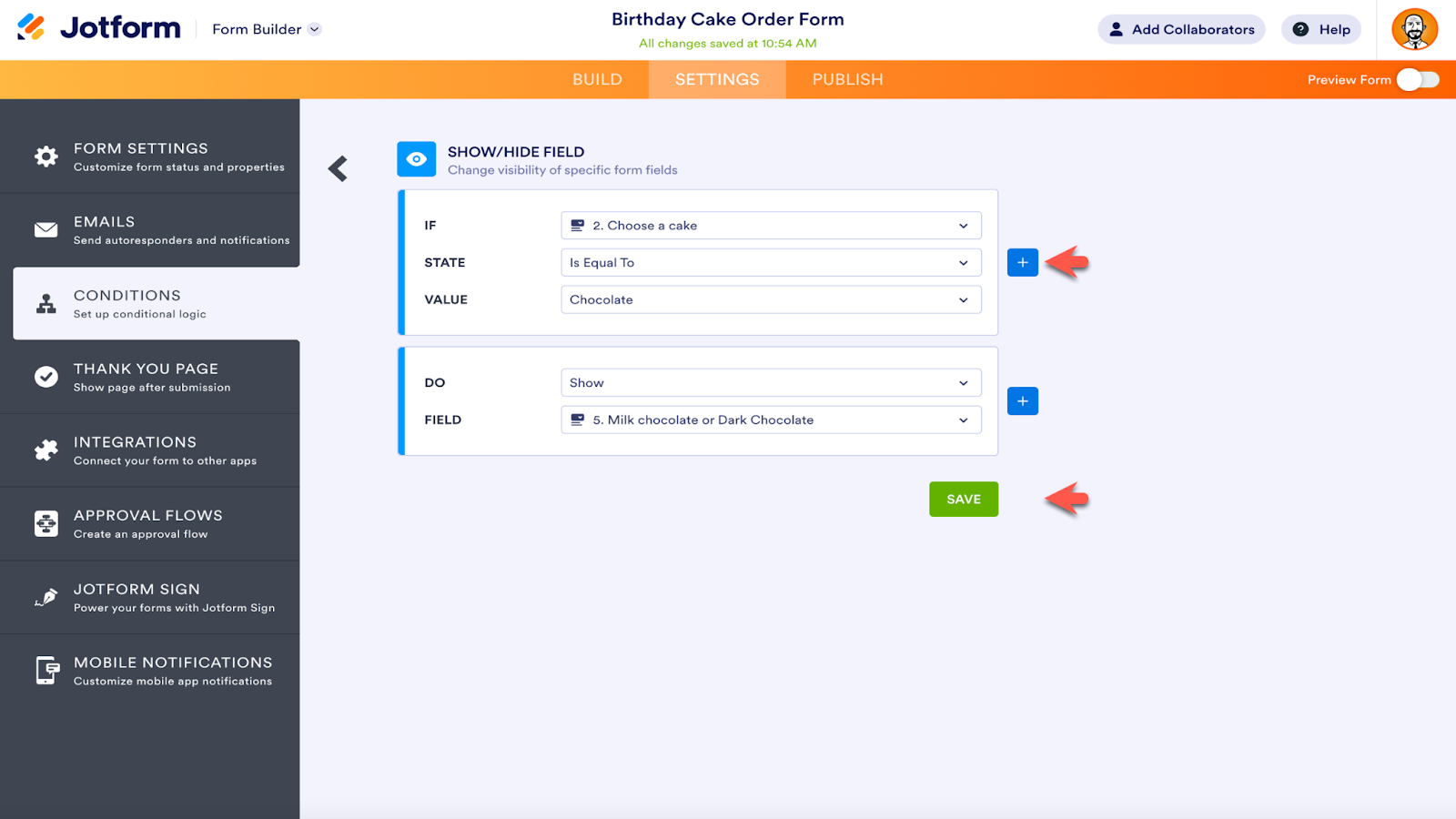 Since customers who want a yellow cake won’t need to answer this question, it will remain hidden. To add more Show/Hide Field options, click the plus sign icon to the right of the conditions. Select Save when finished.