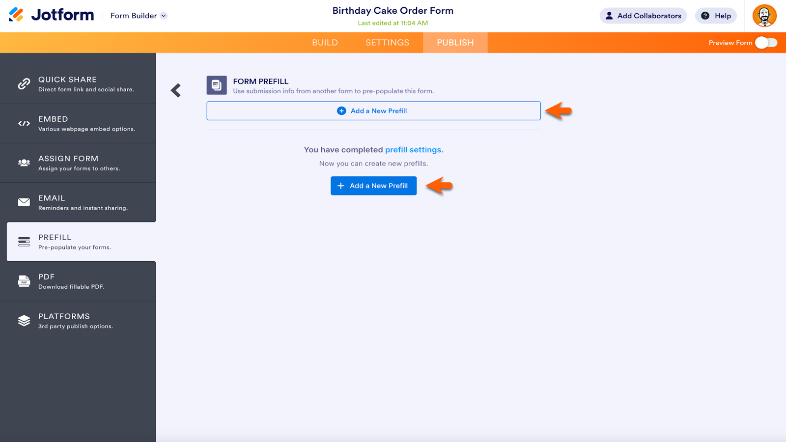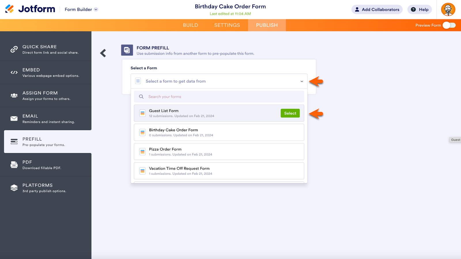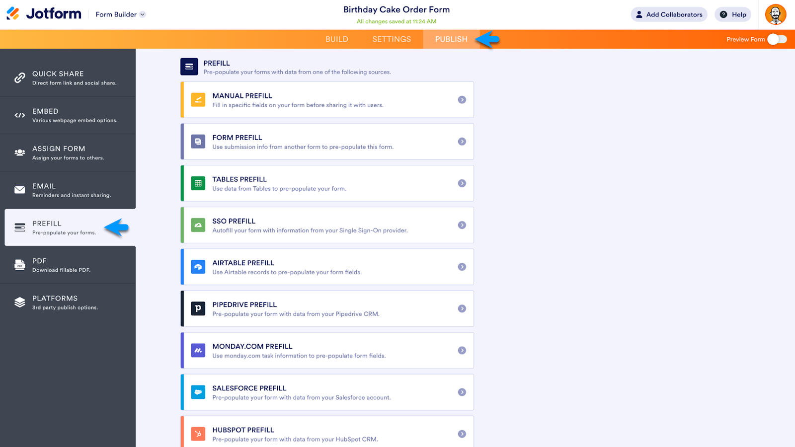 To access Jotform Prefill, go to the Publish section of the Form Builder. There’s a robust list of Prefill options, from Manual Prefill to Airtable, Pipedrive, monday.com, Salesforce, and HubSpot.