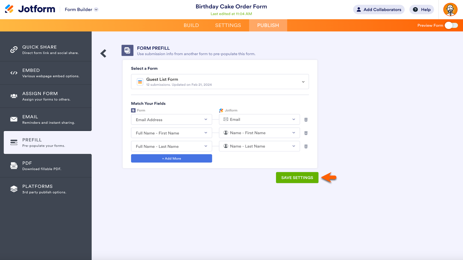 Next up, match the fields you’d like to prefill. The columns on the left represent incoming data. The columns on the right represent the form fields that will be prefilled. Delete connecting rows with the trash icon on the right. If there are additional fields you’d like to connect, click the Add More button. Click the Save Settings button when finished.