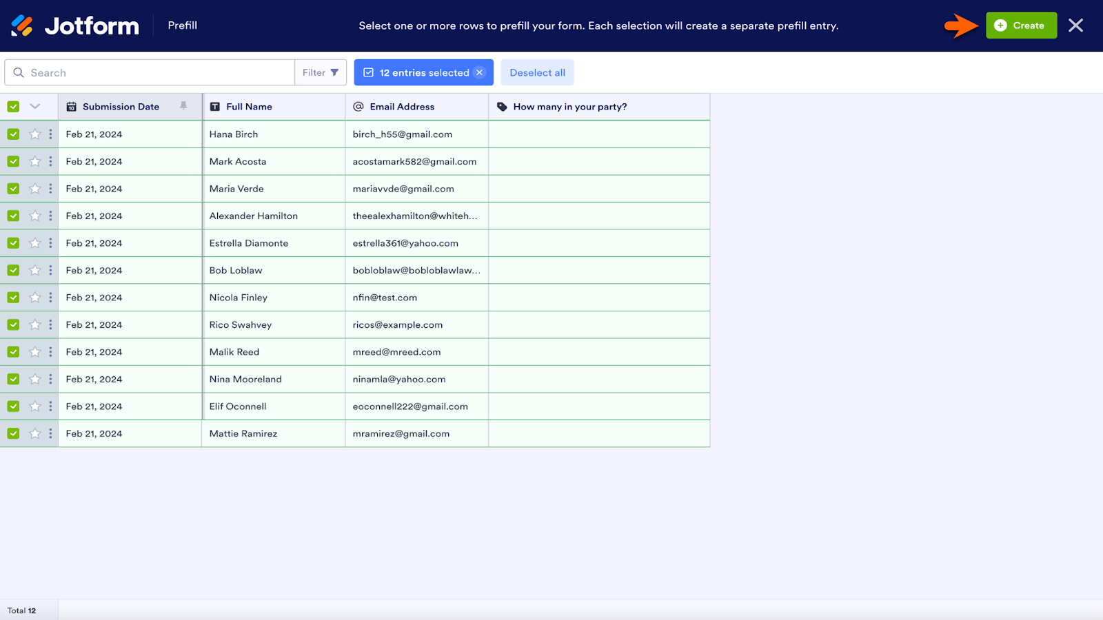Select individual submissions in the table or select them all by checking the boxes on the left. When finished, click the Create button.
