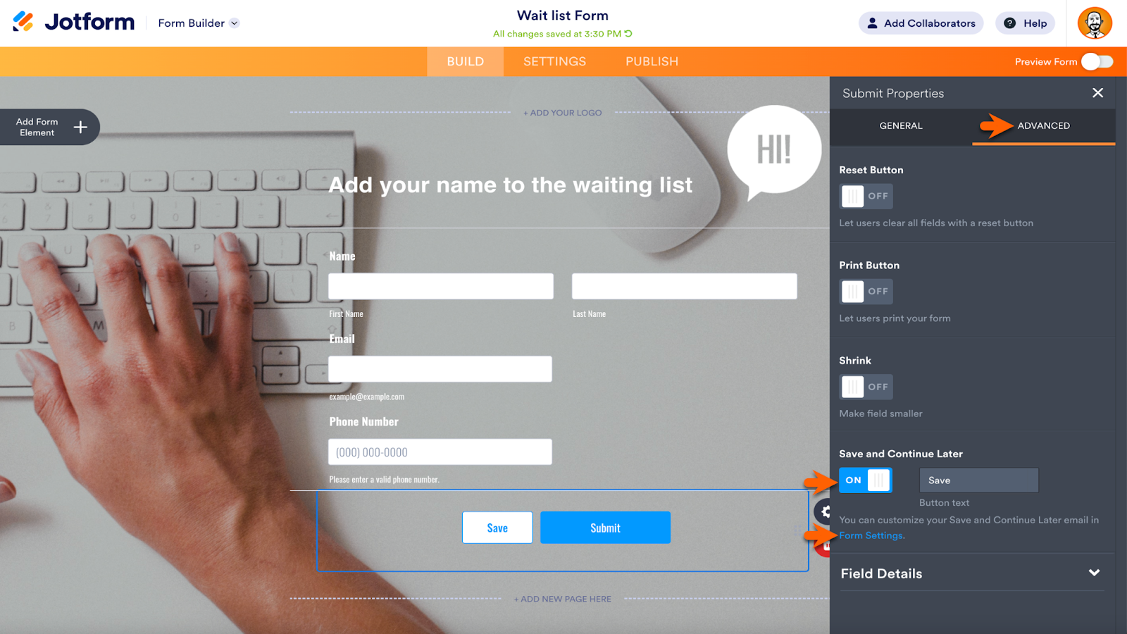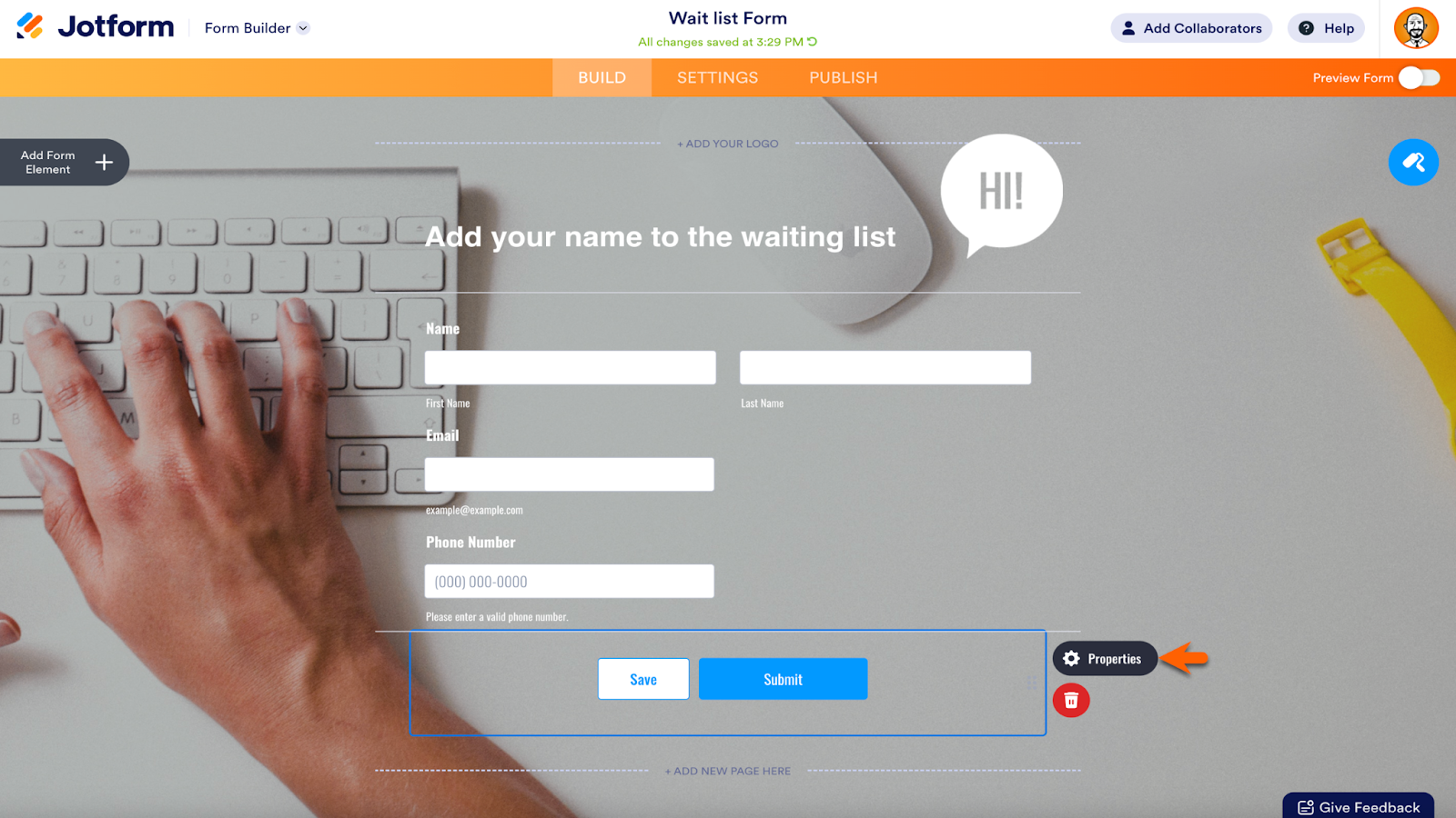 To activate this feature in the Jotform Form Builder, open the Submit button Properties.