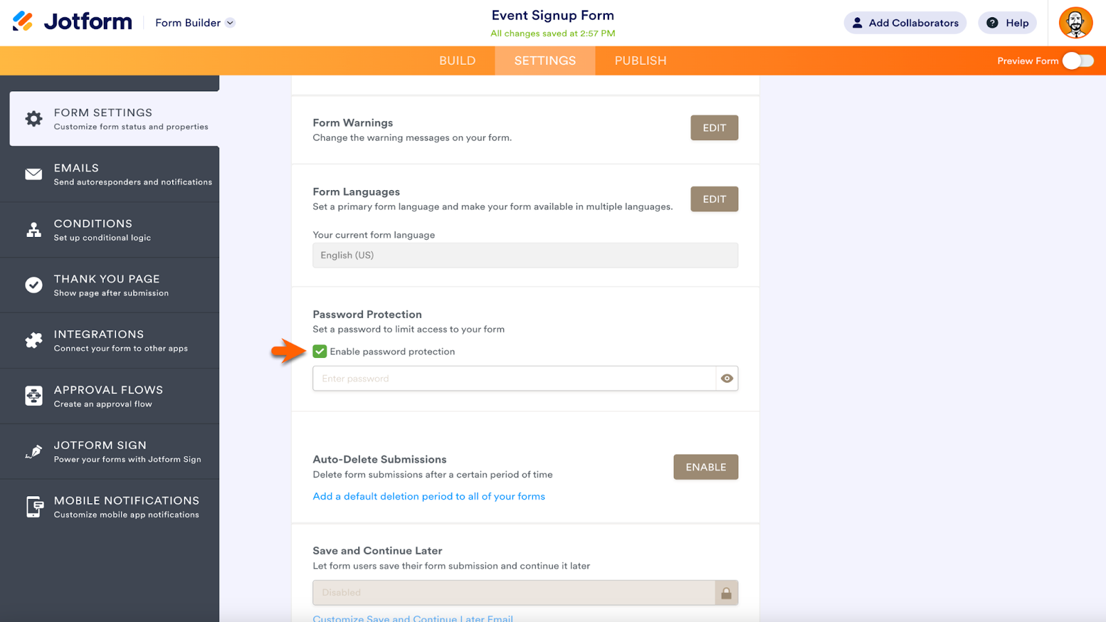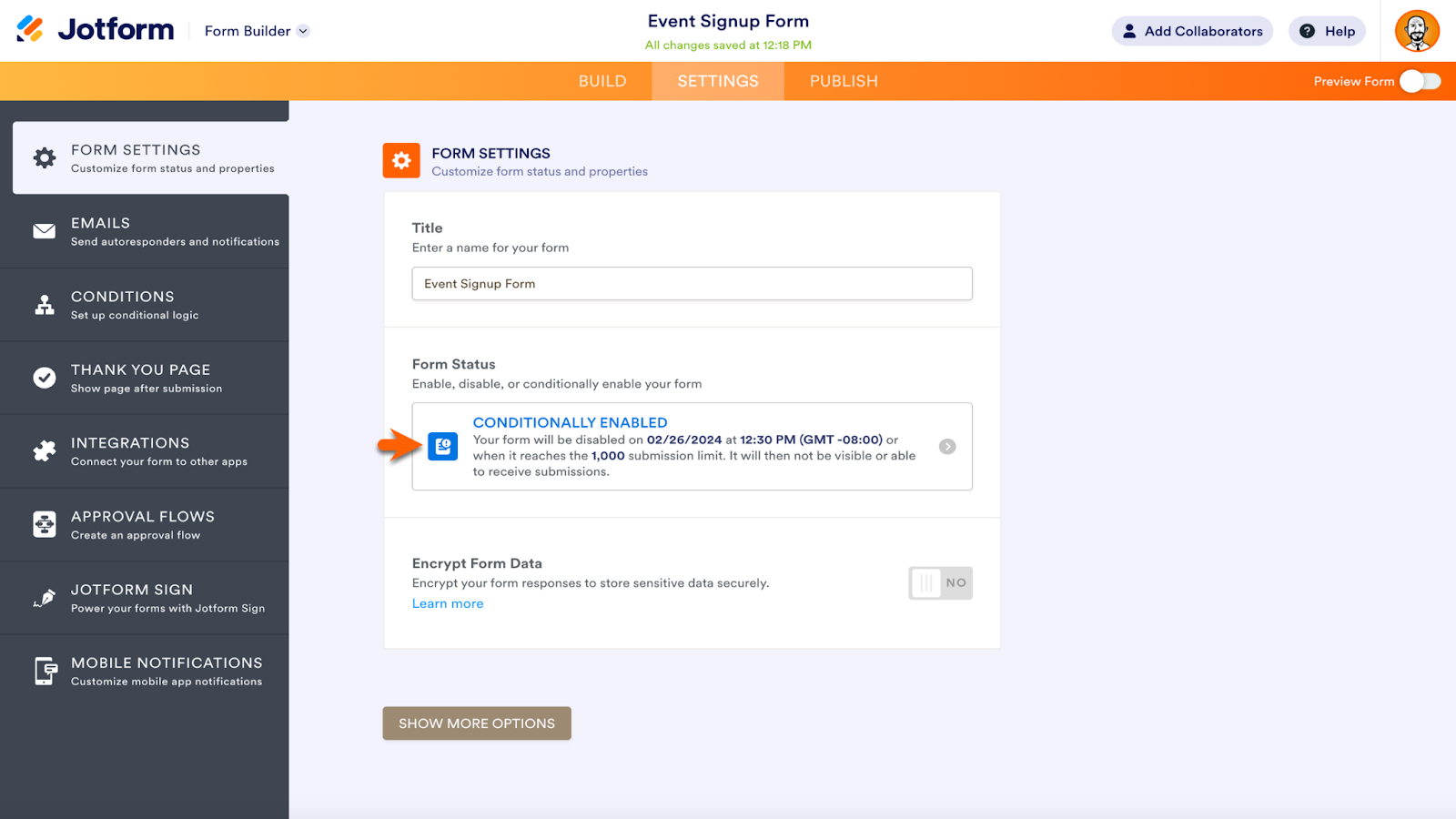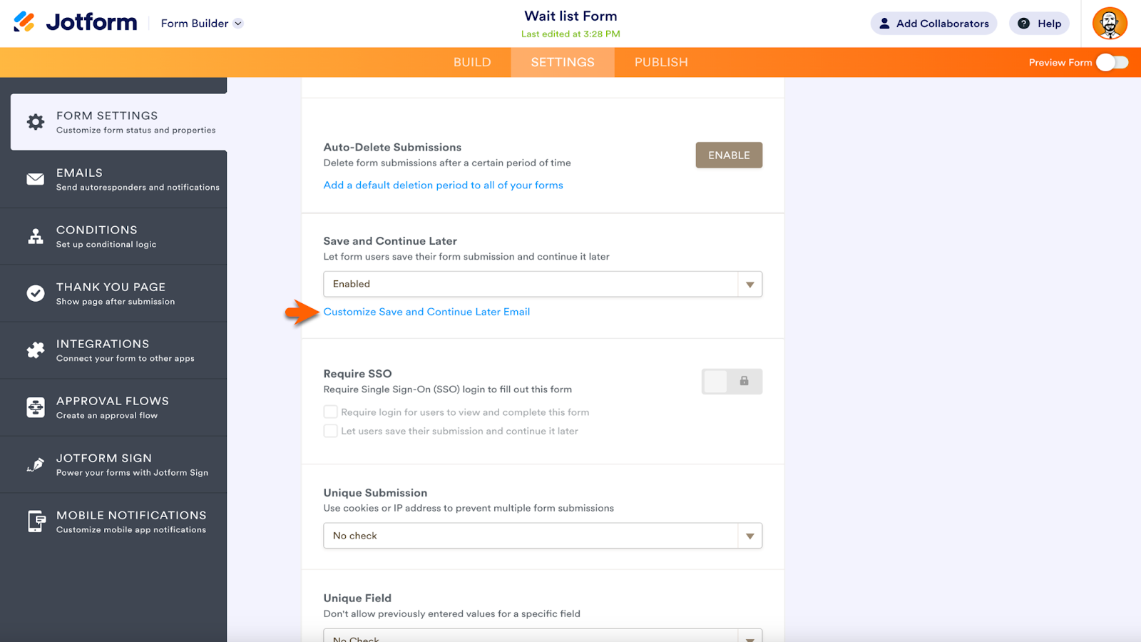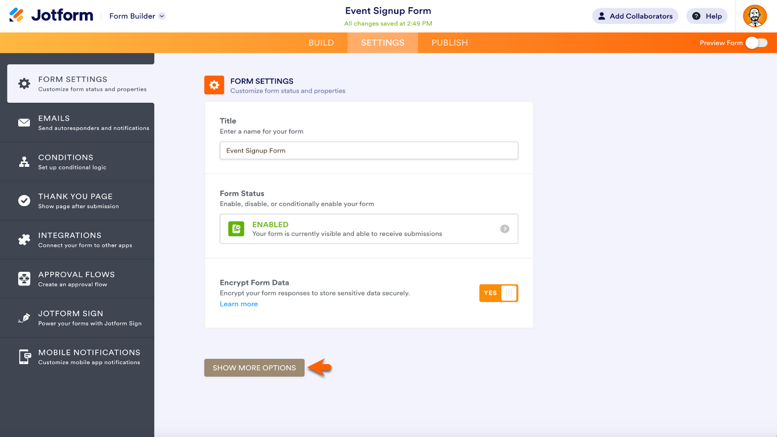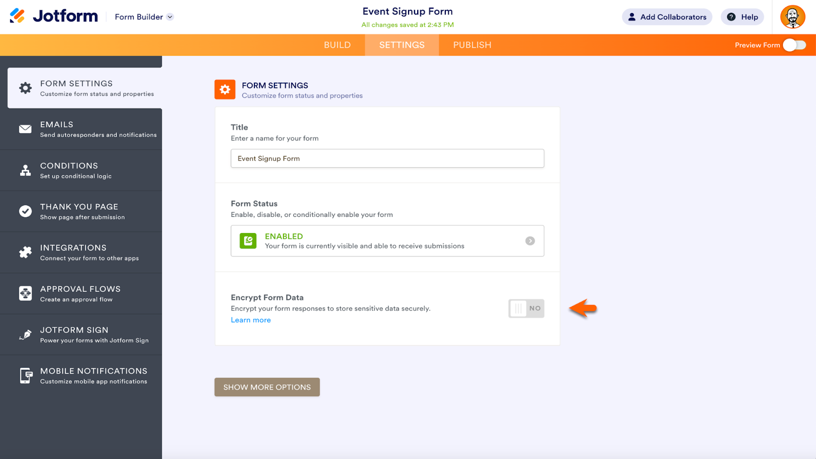 Within the Form Settings, click the Show More Options button to expand the Settings menu. Scroll down until you see the Save and Continue Later section. Enable or disable the feature in the dropdown menu. Click the link below the menu to customize your Save and Continue Later email.