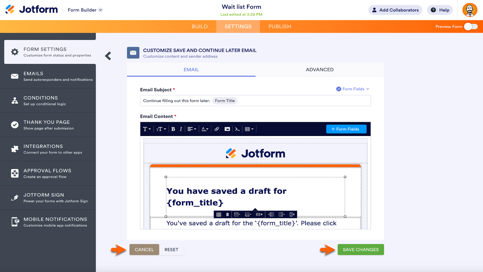 Next, go to the Advanced section of the Properties menu. Click the toggle for Save and Continue Later to the On position. To the right of the button, enter the text that will appear on the Save button. Click the Form Settings link near the bottom of the screen to customize automatic reminder emails for those who have started to fill out your form but haven’t finished.