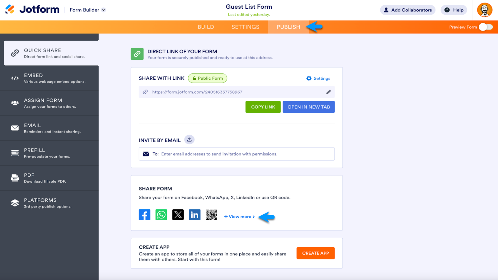 The Share Form section provides links to share your form via social media or a unique QR code. Click View More to open the full list of social media share options.