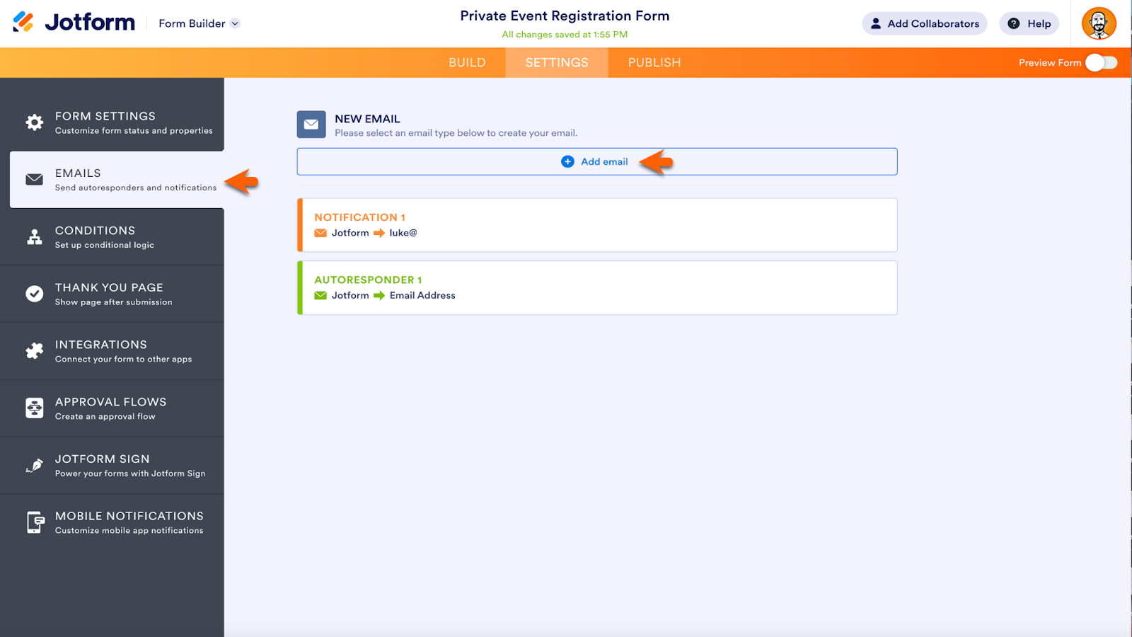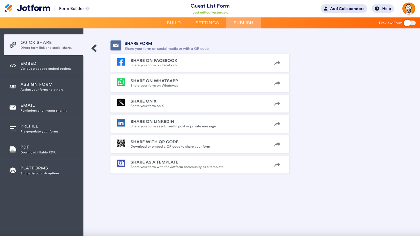 Jotform form distribution features deliver your form to its target audience, whether it’s meant for the entire world to see or catered to one specific person.