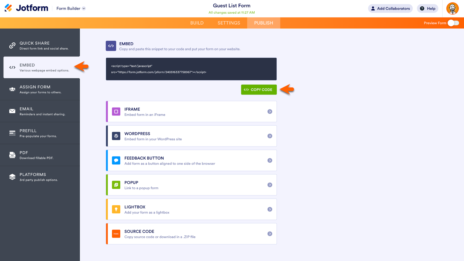 To embed your entire form into your website, access the Embed options within the Publish section of the Form Builder. The embed code for your form appears at the top of the screen. There are other embed options available, including code made specifically for WordPress.