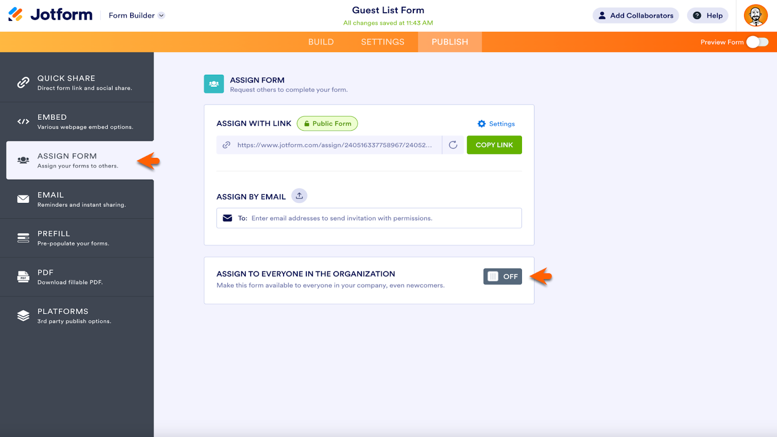 Jotform Enterprise users can use the Assign Forms feature to assign the form to everyone in their organization with one click via a button at the bottom of the page.