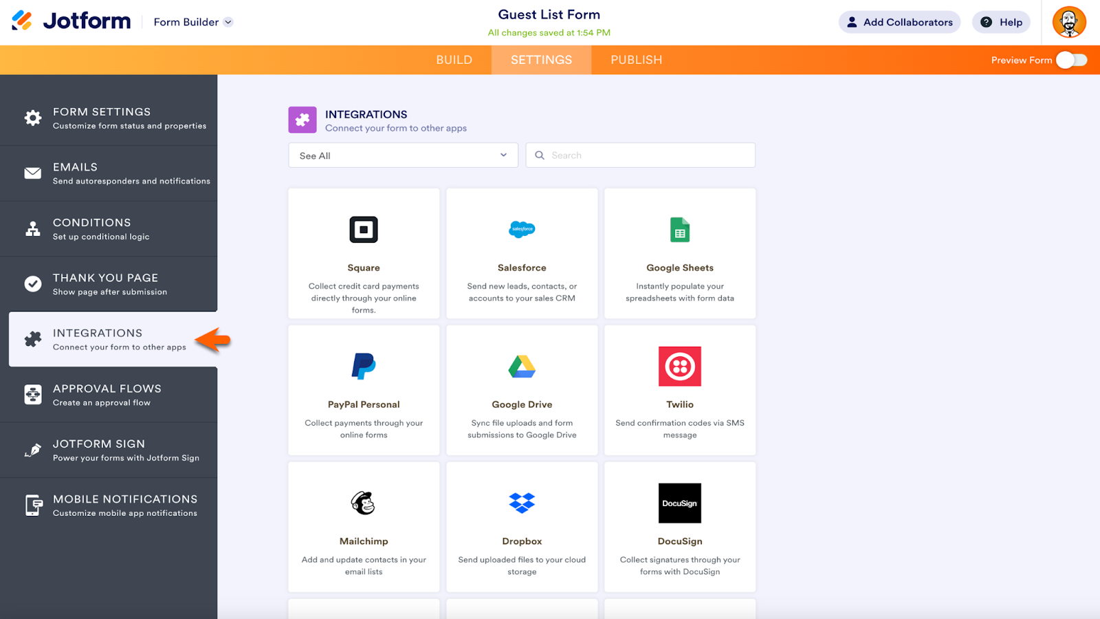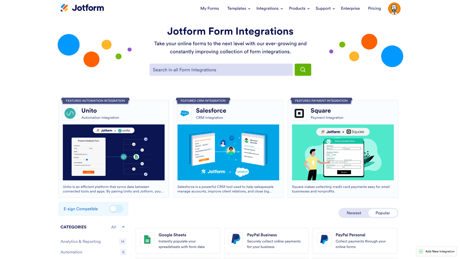 Jotform’s entire library of integrations is easy to find. Use the Integrations dropdown menu in the top banner on the Jotform website.