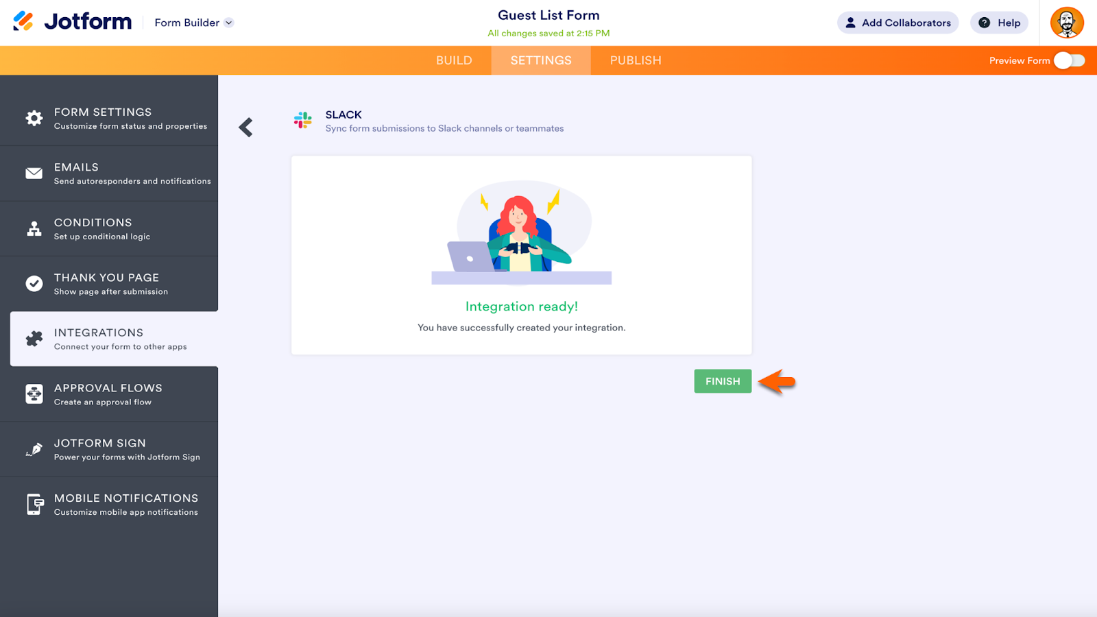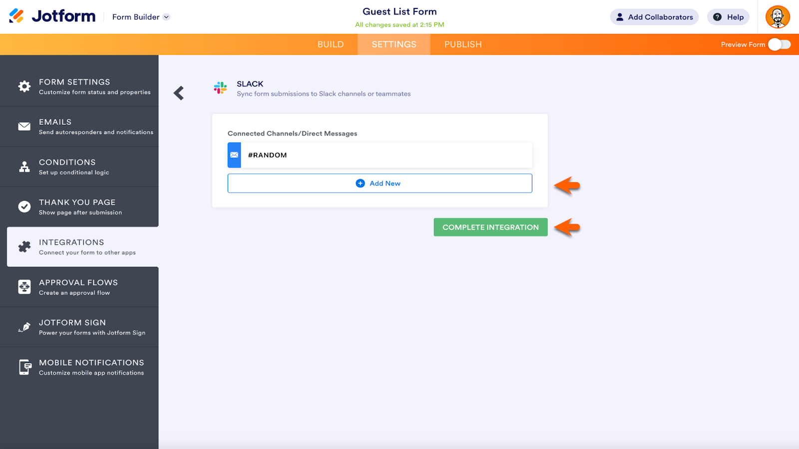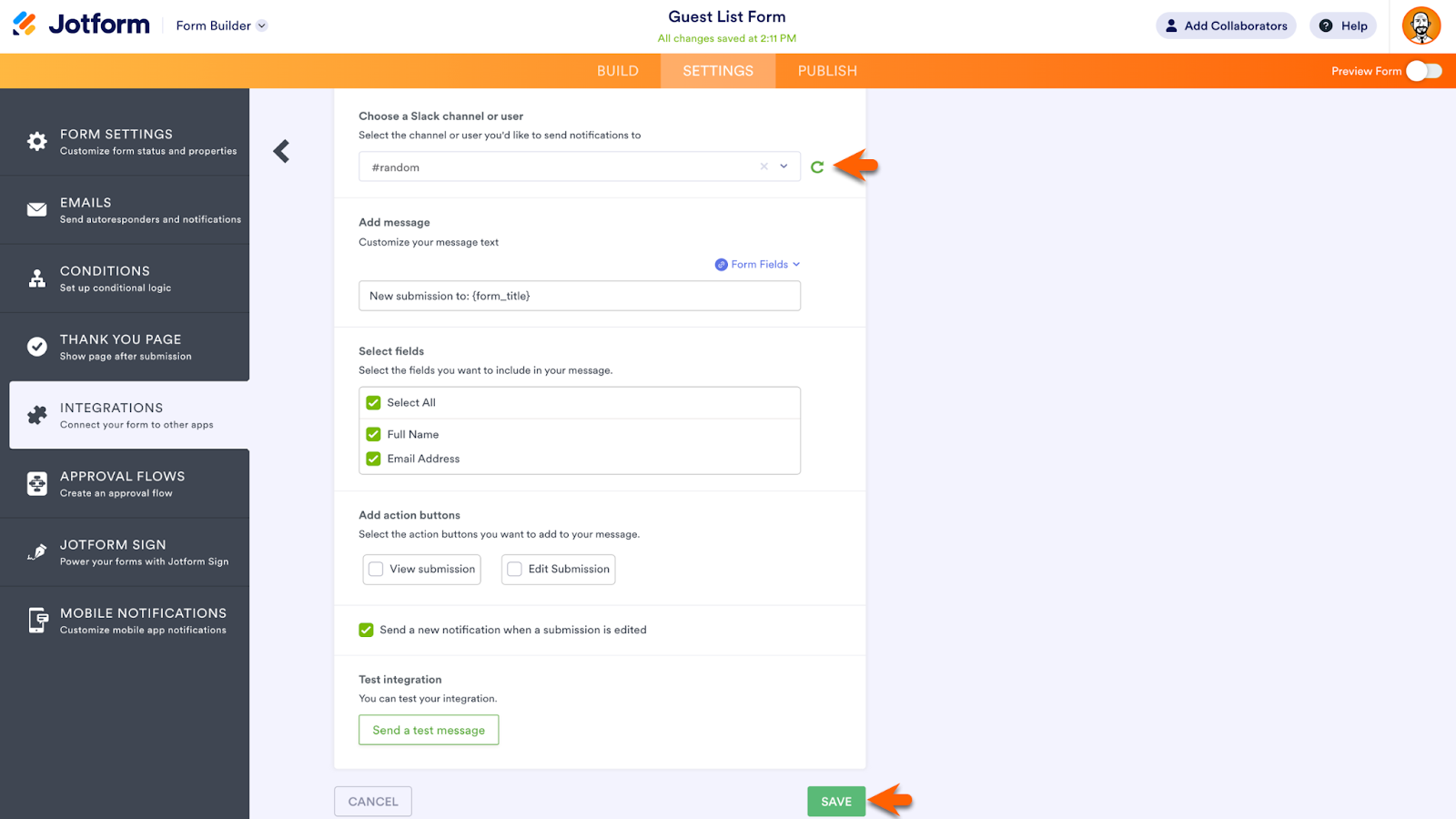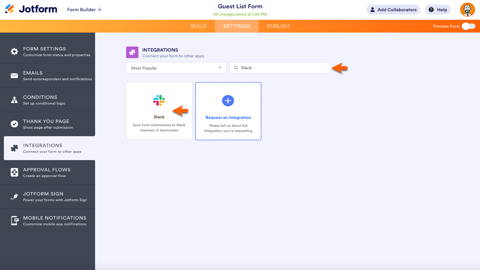 Each integration takes just a few steps to add. For example, to send submission data to your preferred Slack channel or via Slack direct message, go to the Integrations tab, found in the Form Builder Settings.