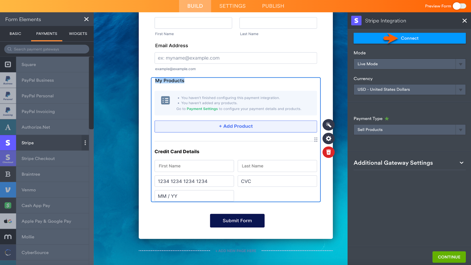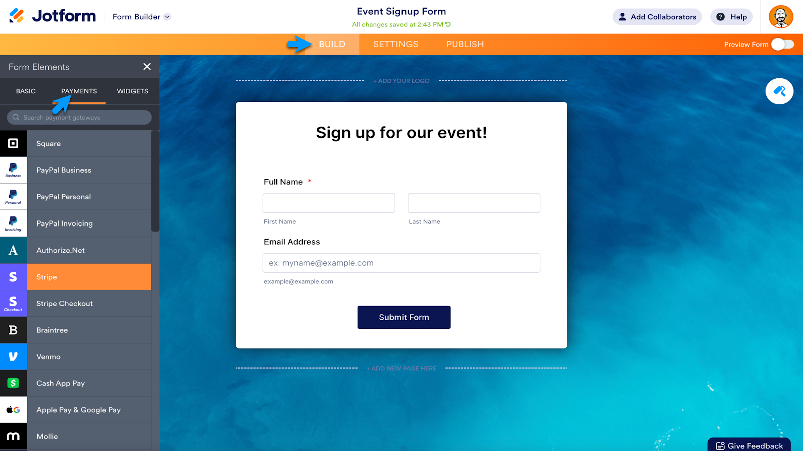 Add a payment integration from the Integrations section of the Form Builder, or find your preferred payment integration within the Form Elements. The Payments section is next to the Basic elements. Click your preferred payment integration or drag and drop it onto your form.