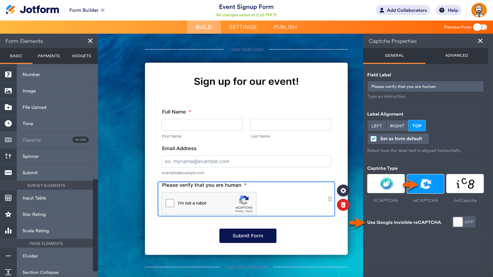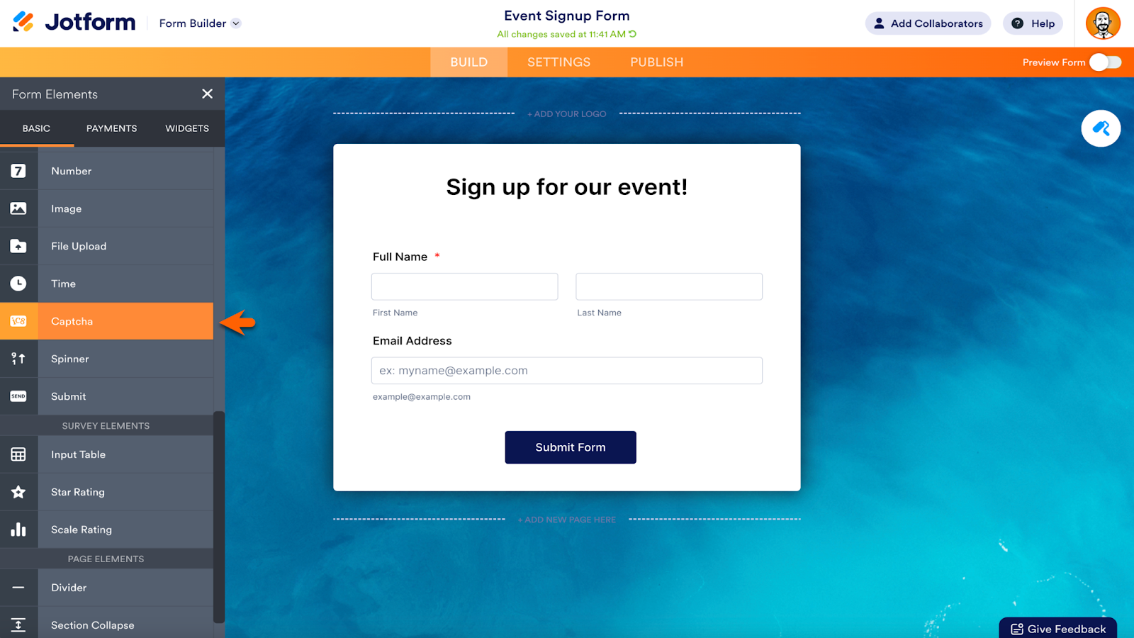 Jotform’s Captcha form element provides this safeguard. It’s located in the list of Basic form elements within the Form Builder. Click the element or drag it onto your form to add it.