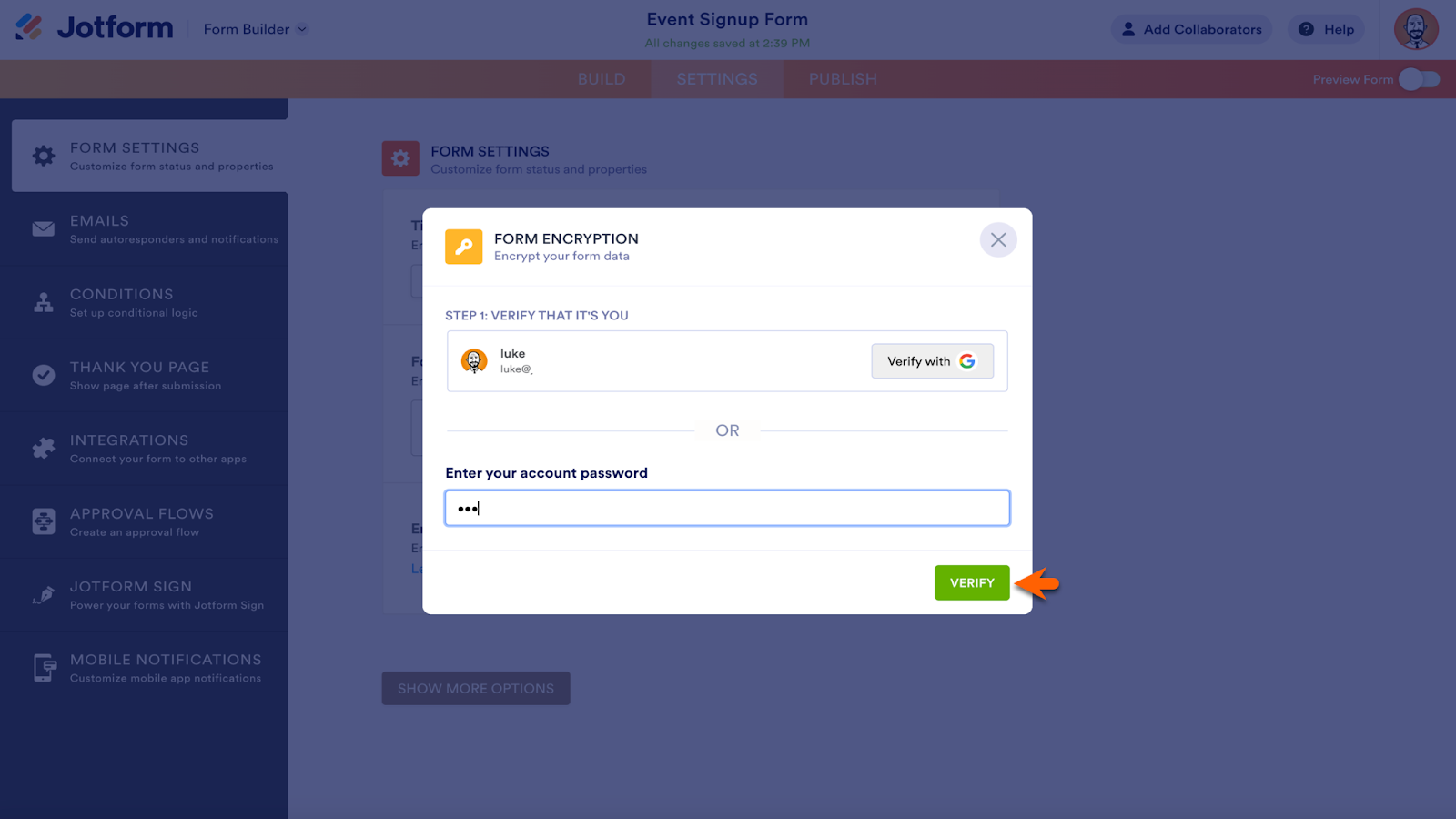 Next, verify your Jotform account with Google or your password. Click Verify to continue.
