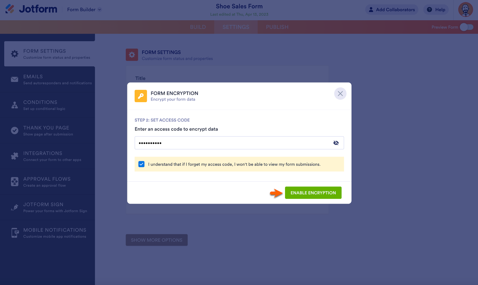On the following screen, create an access code in the space provided. Check the box that explains your access code will be needed to view form submissions. When ready, click Enable Encryption.