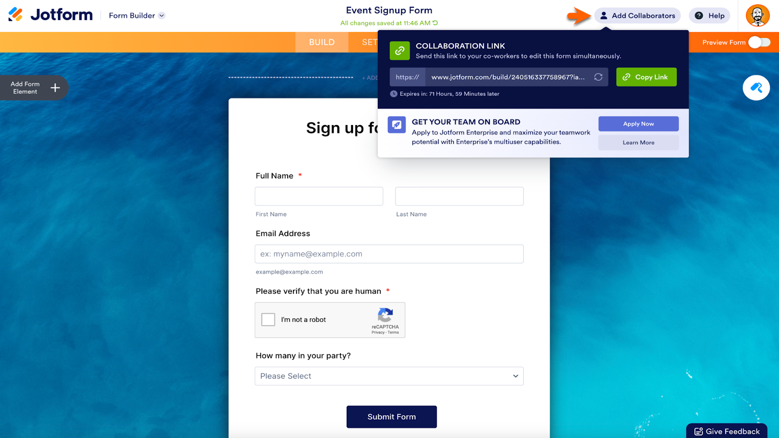 Jotform has clarified the process of adding collaborators to your form. The Add Collaborators button is now at the top of the Form Builder. The new design of the popup, which includes a clock icon and a countdown underneath the link, makes it clear when the collaboration link will expire.