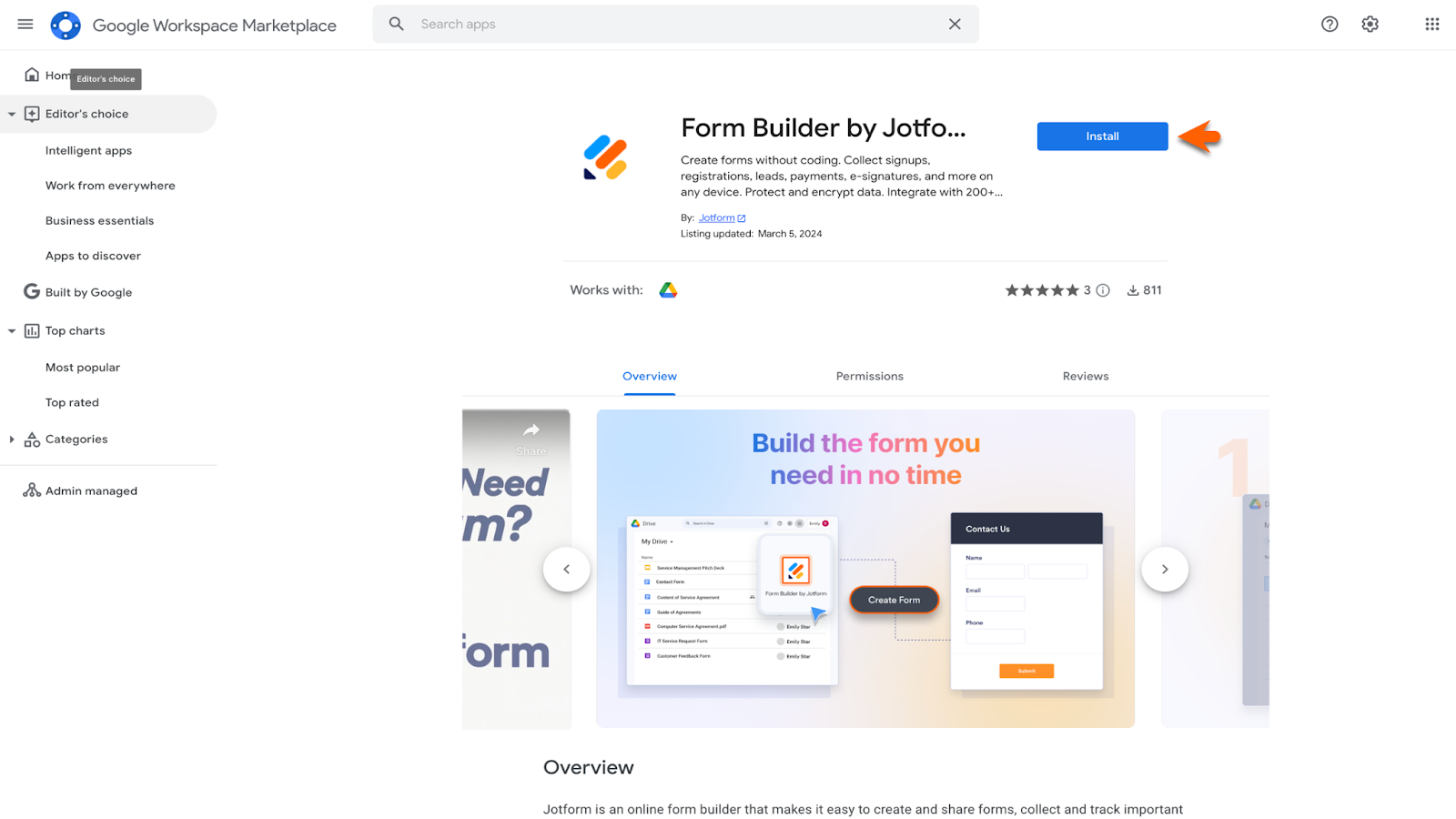Simply search for and select Form Builder by Jotform in the marketplace, click the Install button, and log into your Jotform account.