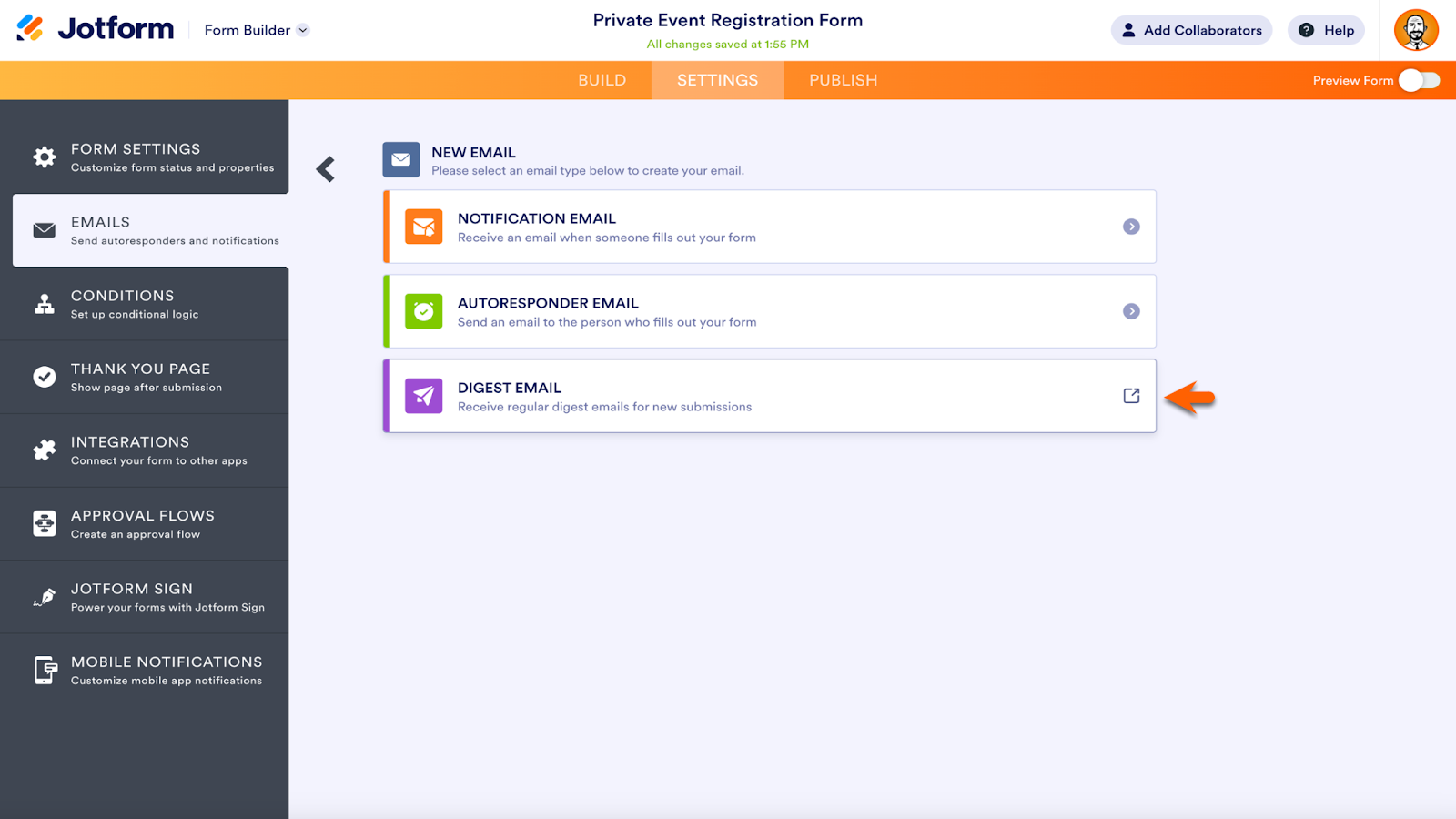 Jotform’s Digest Emails, which gather insights from multiple forms in a single email, debuted in 2023. At the request of Jotform users, this feature is now available within the Form Builder.