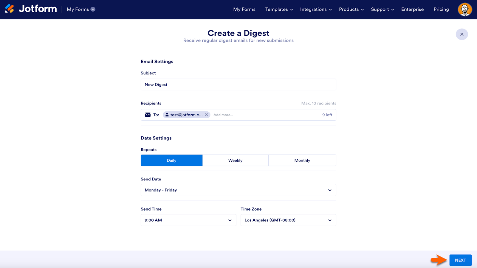 The Form Builder will open the Digest Email settings in a new tab in your browser. Choose who you’d like to receive the digest, how often it’s produced, and what time it’s sent. Click the Next button to customize the look of the email.