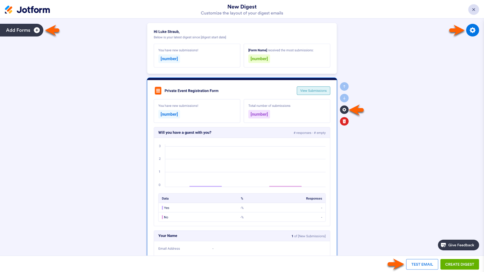 When you click on an element within the body of the email, a gear icon appears next to it. Click on the icon to customize the look of your digest email. You can include more forms in your email with the Add Forms button.