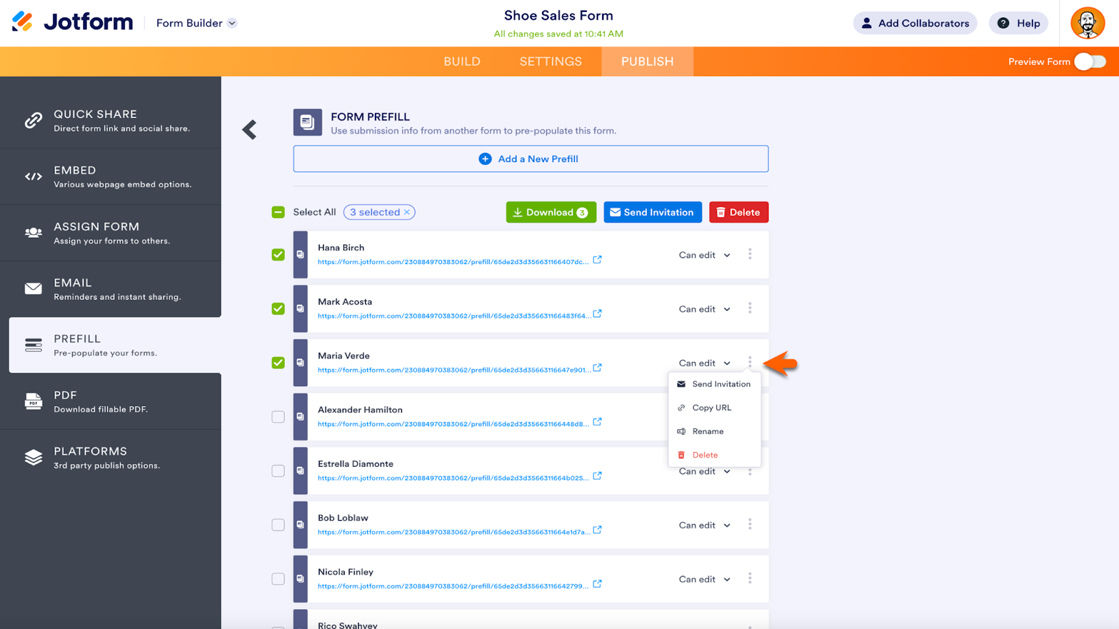 Open the menu to the right of each entry to send an invitation, copy the URL, rename the prefilled URL, or delete it.