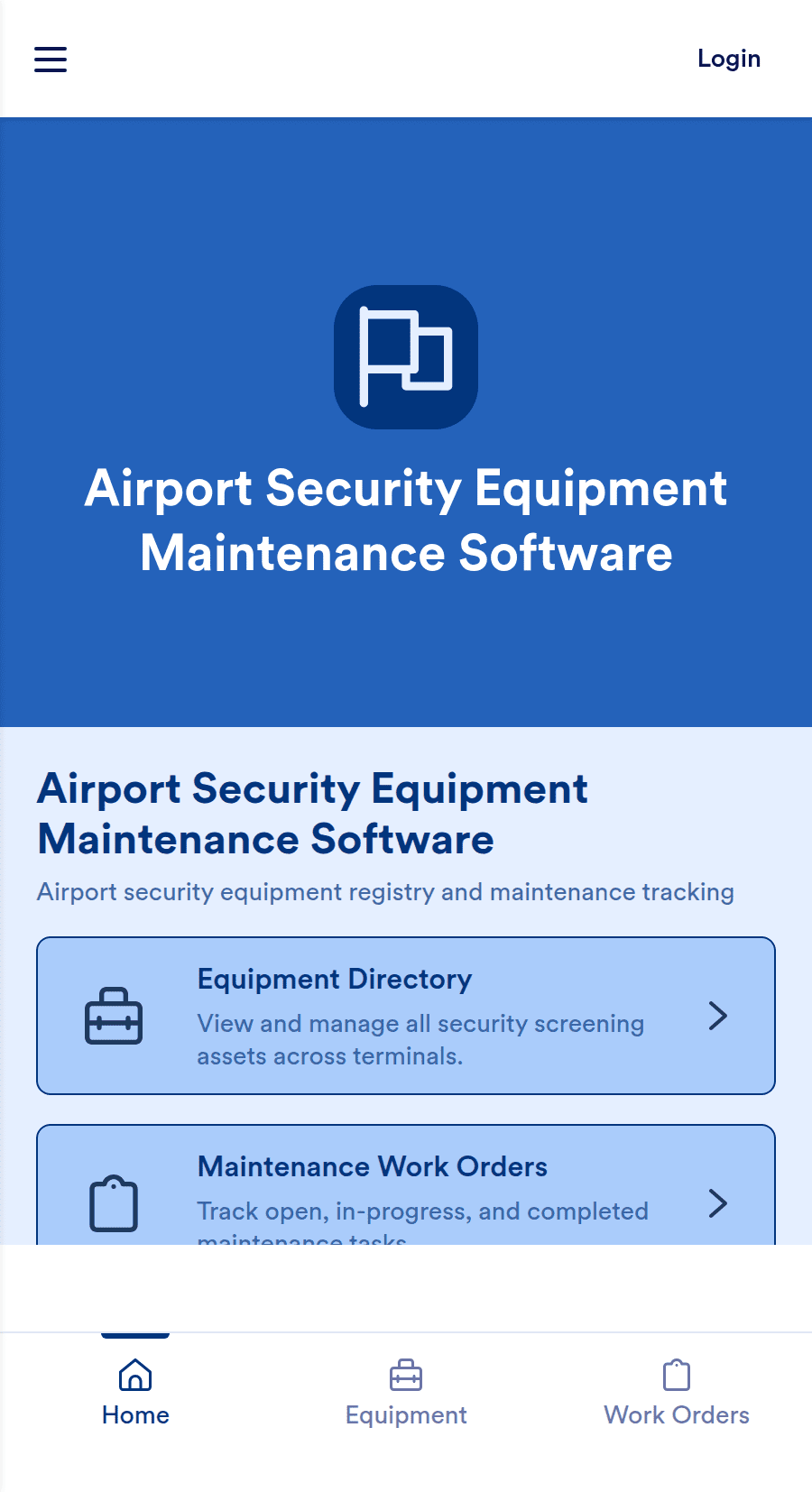 Airport Security Equipment Maintenance Software is an application designed to assist in the management, tracking and maintenance of airport security equipment. Its purpose is to streamline operations and ensure equipment upkeep for optimal safety and security.